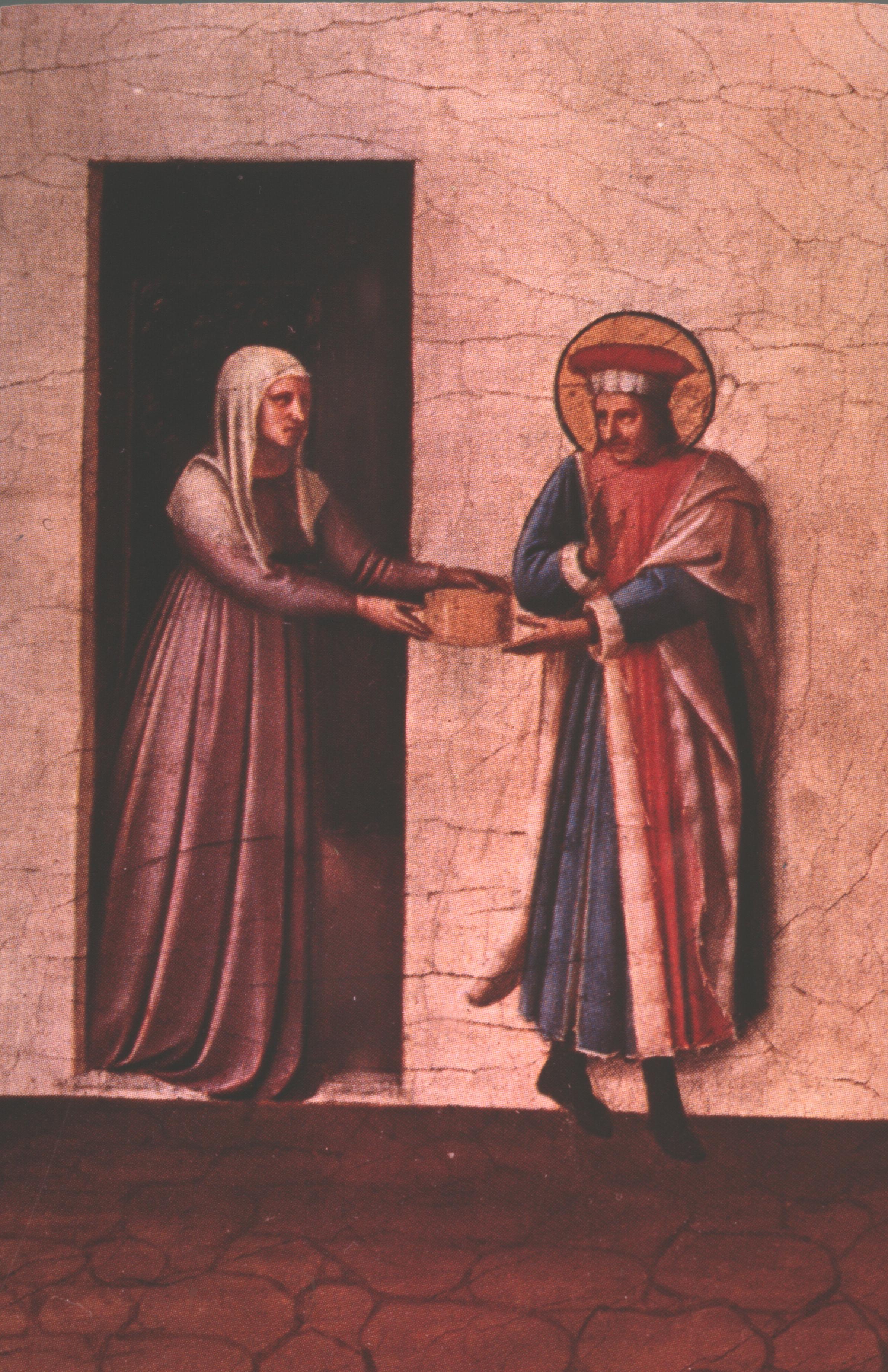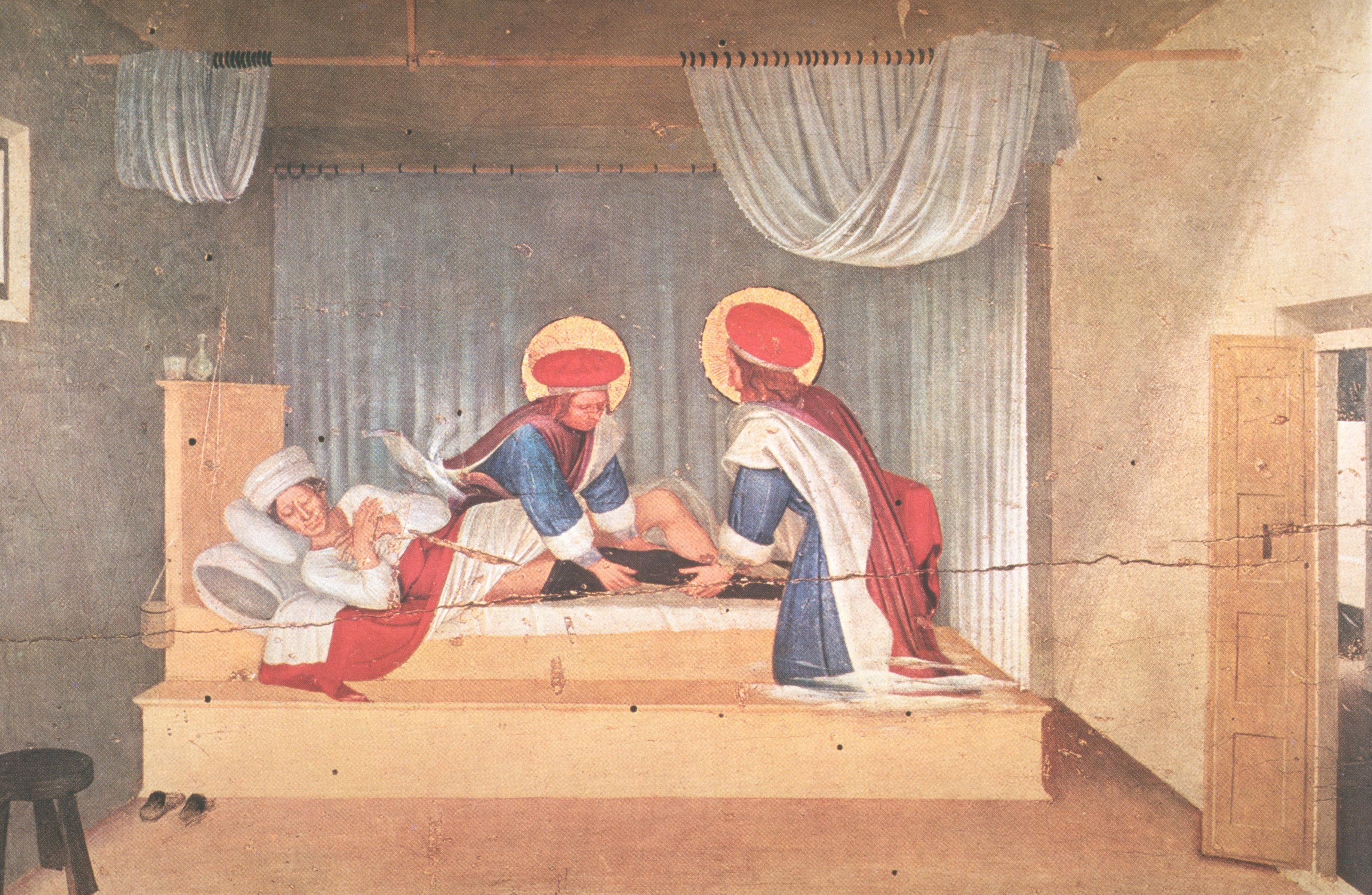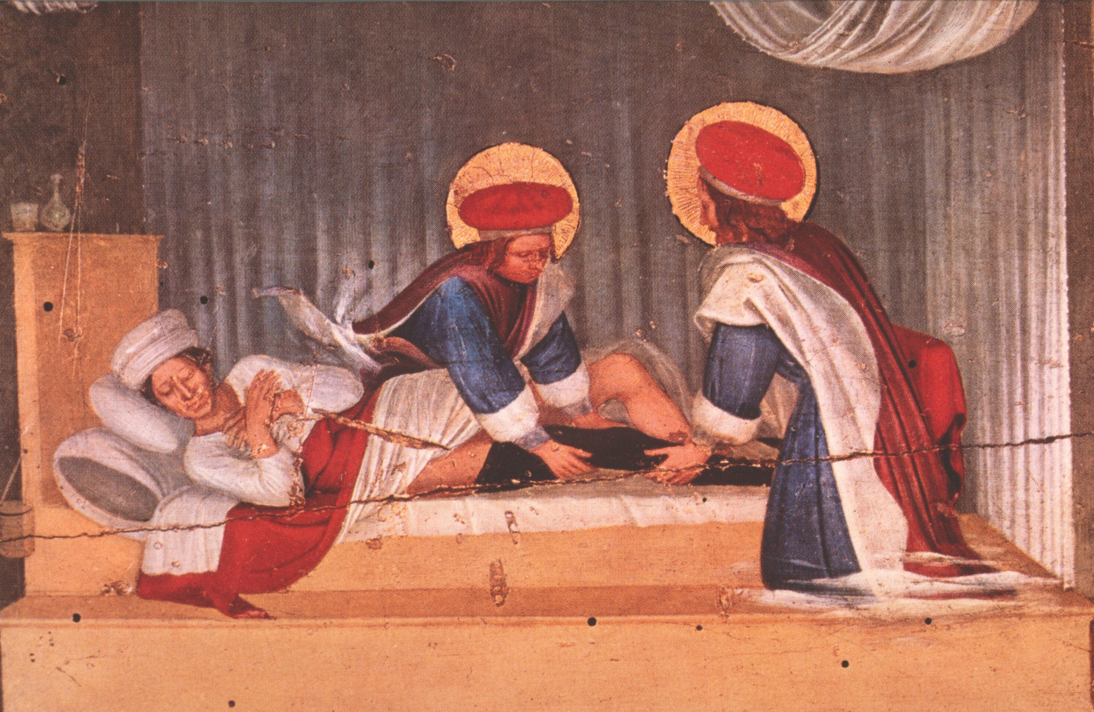 ‘Cosmas and Damian were brothers and were born in the city of Egea. They were skilled in the art of medicine, and had been endowed by the Holy Spirit with such grace that they healed all ills, of men and beasts, serving all without recompense. A certain lady named Palladia, who had expended all her wealth for the services of physicians, came to them and was completely healed’ (Giovanni has enhanced their virtue by having them pay her a ‘home visit’).