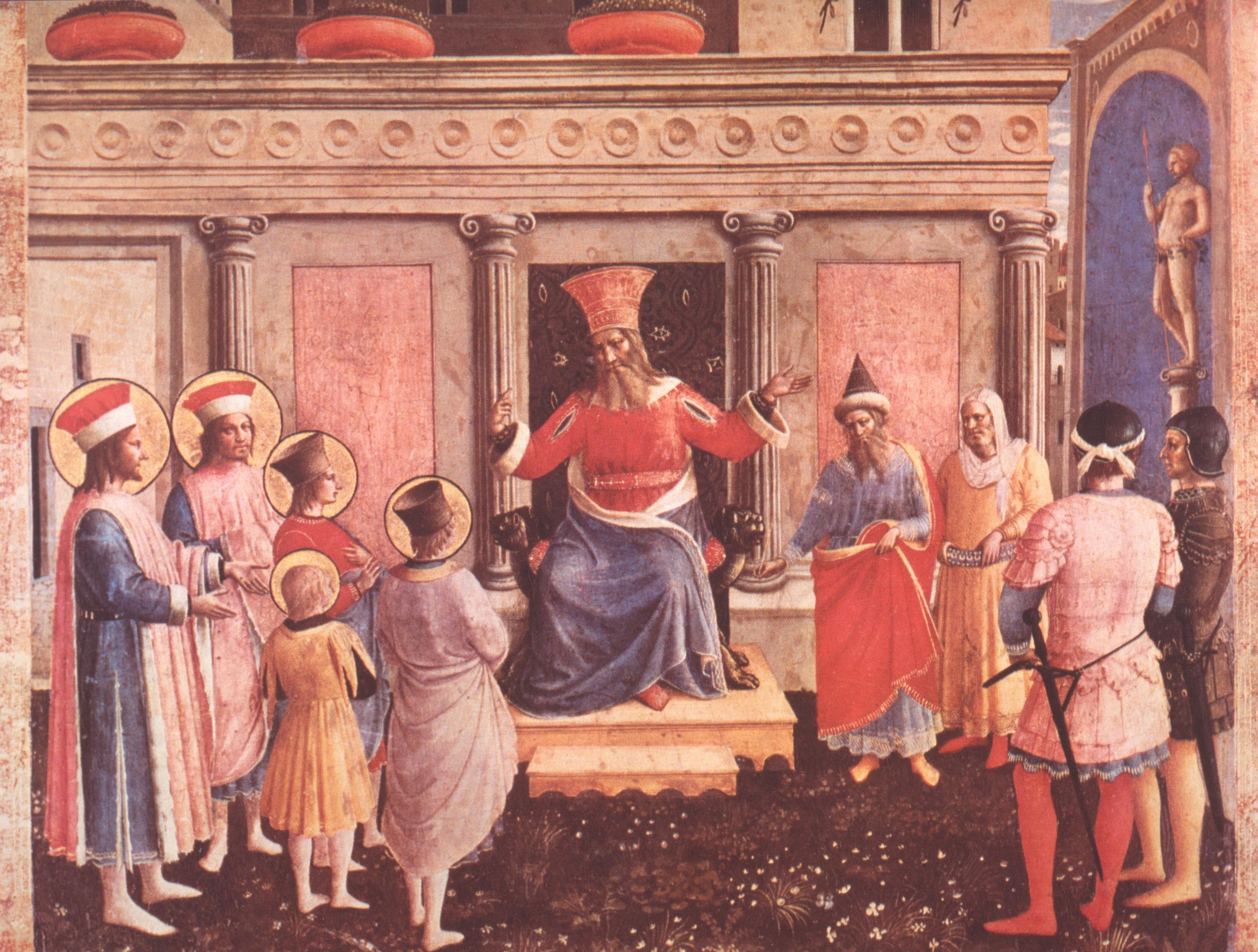 Classical pilasters frame marble panels and support a classicising entablature (ornamented with little roundels), on the top of which there stands (a ‘vernacular’ touch) three bright-red earthenware flower bowls foreshortened from below, while a loggia on the right protects the statue of a pagan, ‘martial’ god (he is naked and carrying a spear), and yet allows just enough space for us to glimpse a street and the sky. Add to these architectural clues the exotic, oriental hats of the figure on the throne and of his official, and it should be clear that we are in front of the palace of a pagan ruler somewhere in Asia Minor. The question you should be asking is, of course, why are there now no fewer than five figures with halos in front of this man in authority? The answer will revealed in the words of the Legend; but before we read them, take a moment to enjoy the colours. A very dark green lawn with flowers (a kind of artificial turf that Giovanni’s workshop could always roll out on demand) sets off the softer tones of the building and of the foreground soldier, while characteristic splashes of red, yellow and blue are distributed all over the surface in hats, clothes, and, not least, bright socks or hose. Notice too a feature which I do not remember seeing in any earlier painting, that is, how the back of the head or hat projects through the flat haloes of two of the brothers (where anybody else might have foreshortened the halo). The Golden Legend continues: