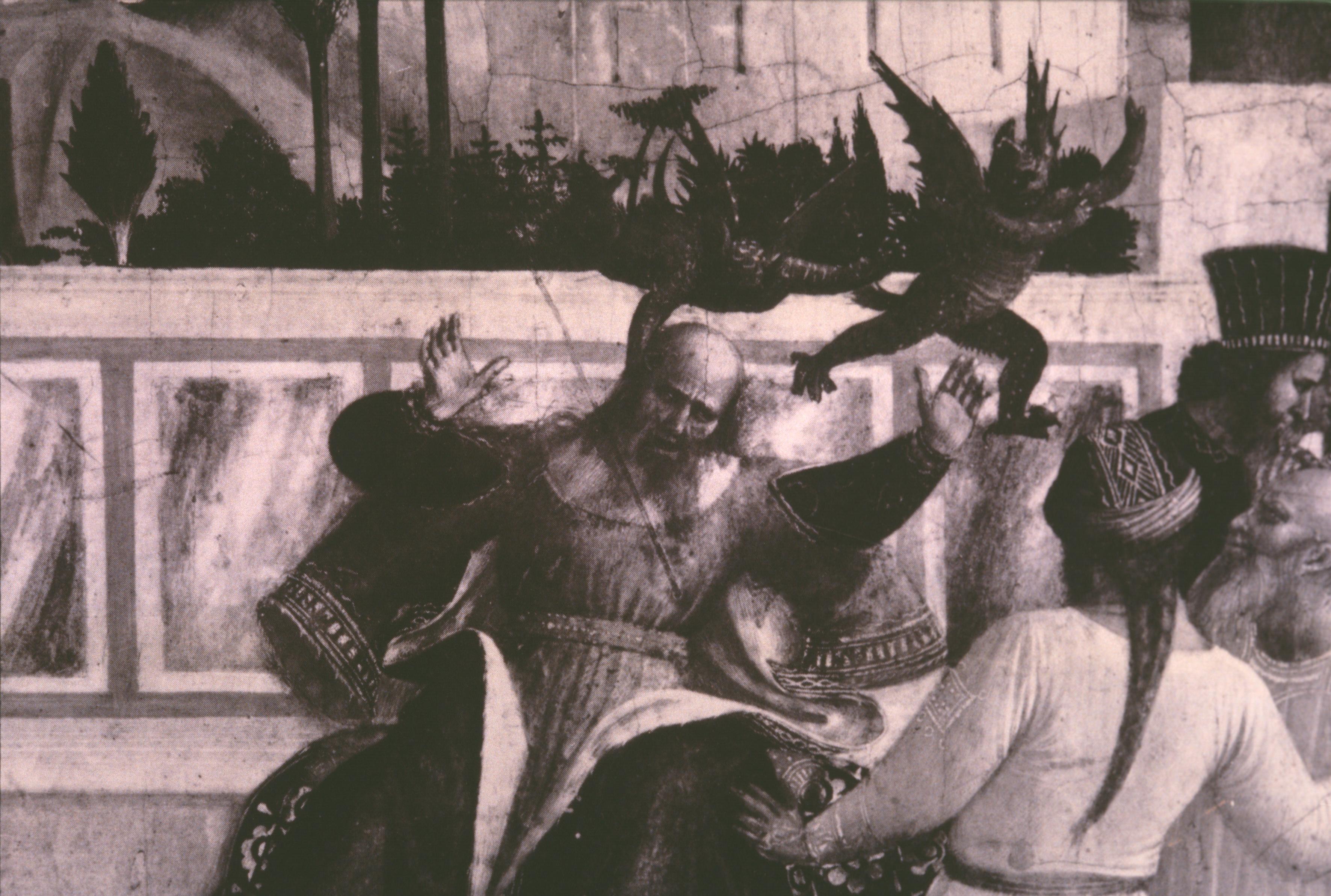 This is the purest Golden Legend material in every possible way, and once again Giovanni rises to the occasion. Nevertheless, as well as asking you to admire the red ‘dandelion’ of the flames, the animation of the guards in their brilliant costumes, or the unforgettable man behind his shield, I should remind you of scenes that were to take place fifty years later before a real Palazzo della Signoria—this time in Florence—when a Dominican from Saint Mark’s, who had successfully challenged the Medici and defied the Pope, made bonfires to destroy the ‘vanities’ of art-loving Florentines, and was himself later burnt alive in the square. I refer, of course, to Savonarola.