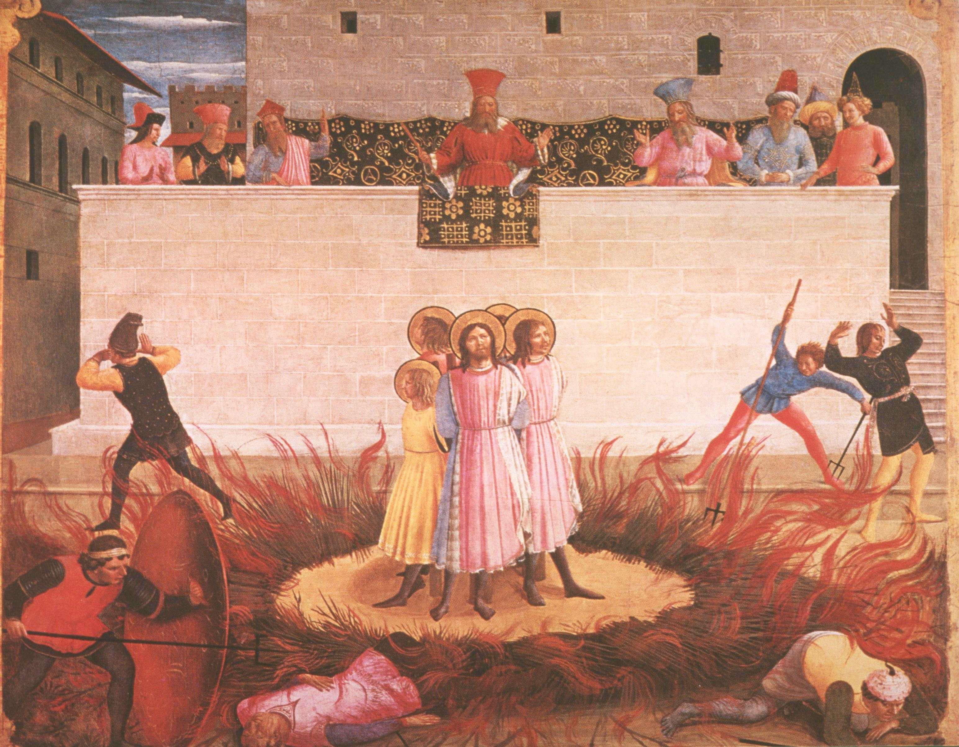 ‘At this said the judge said: “See how angry the Gods are with me, because I thought of abandoning them! I shall no longer suffer you to blaspheme my Gods!” Then he commanded them to be cast into a raging fire; but it did them no hurt, whereas it leapt forth to a great distance and destroyed many of the bystanders’.