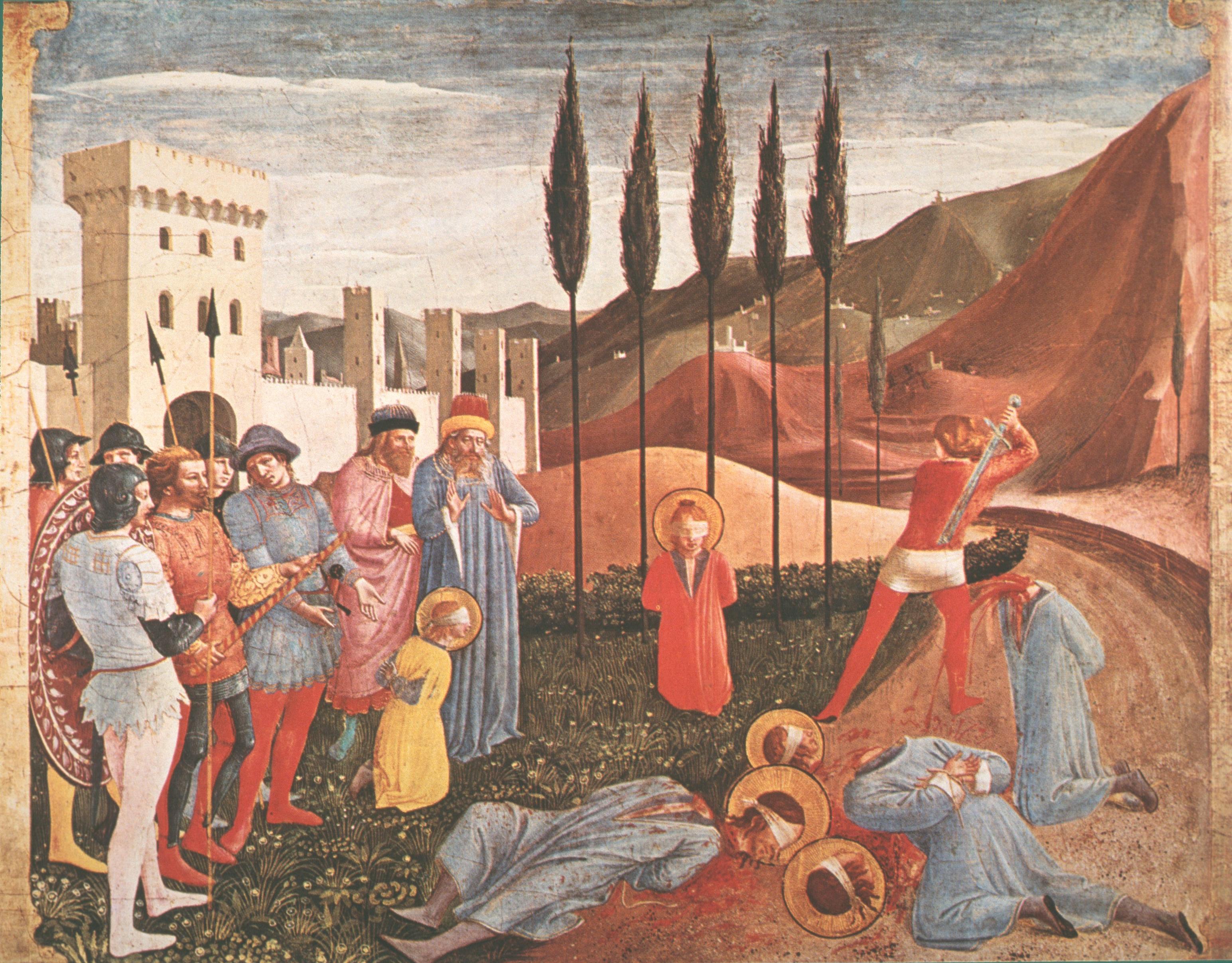 The executioner is going at his work with all the élan of Lewis Carroll’s ‘Beamish Boy’. The ‘vorpal blade goes snicker-snack’, and the haloed heads are off the unnamed brothers before their kneeling bodies have had time to keel over, or the arterial blood to stop pumping out. The involuntary humour of this area helps to keep the emotional temperature low. We might ‘feel’ for Cosmas and Damian themselves, who kneel pinioned and blind-folded, but really we remain as serene in mood as the brightly dressed soldiers of the escort party, or the two bearded officials from the court.