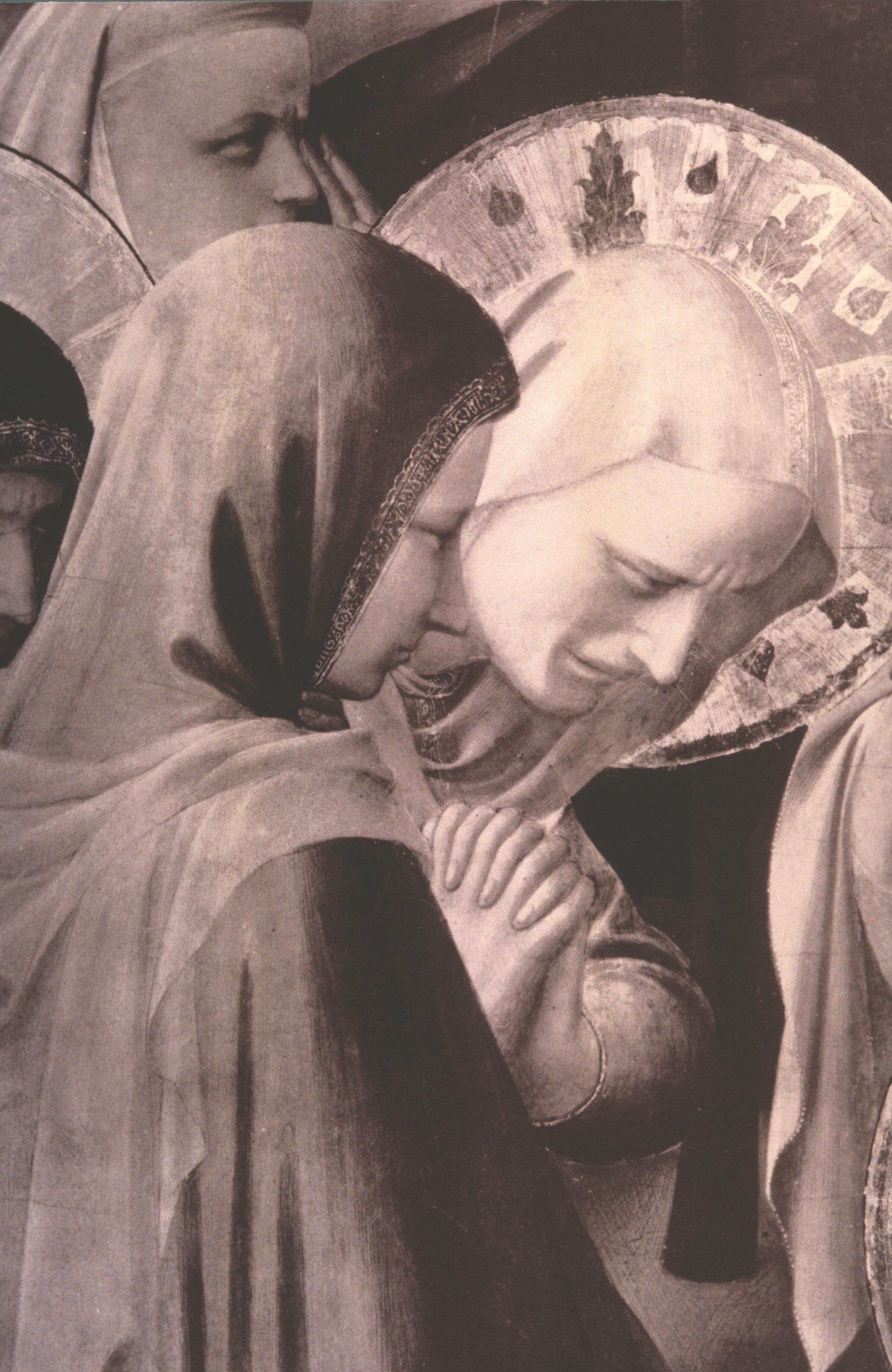 The individual figures are modelled in the round, as you can see in the black-and-white photographs in the two details in fig. 2; a roundness which is very pronounced even in the pinched features of the third Mary, and in the little ‘colonnade’ of her fingers, or again in the long fingers of the male saint.