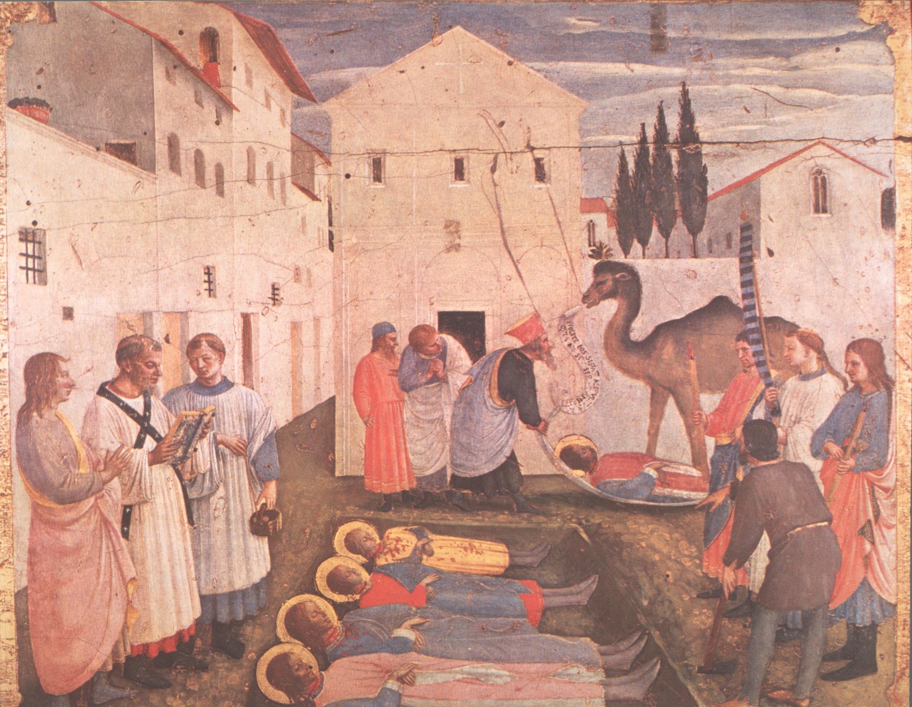 ‘Then the Christians mindful of the command that Saint Cosmas had given them decided to bury the martyrs in separate tombs. But all at once a camel came up, and speaking in a human voice, bade them bury the saints in one and the same place’. (In the detail in fig. 21, you may be able to read the Latin words in the cartouche proceeding from the camel’s mouth: Nolite eos separare…)