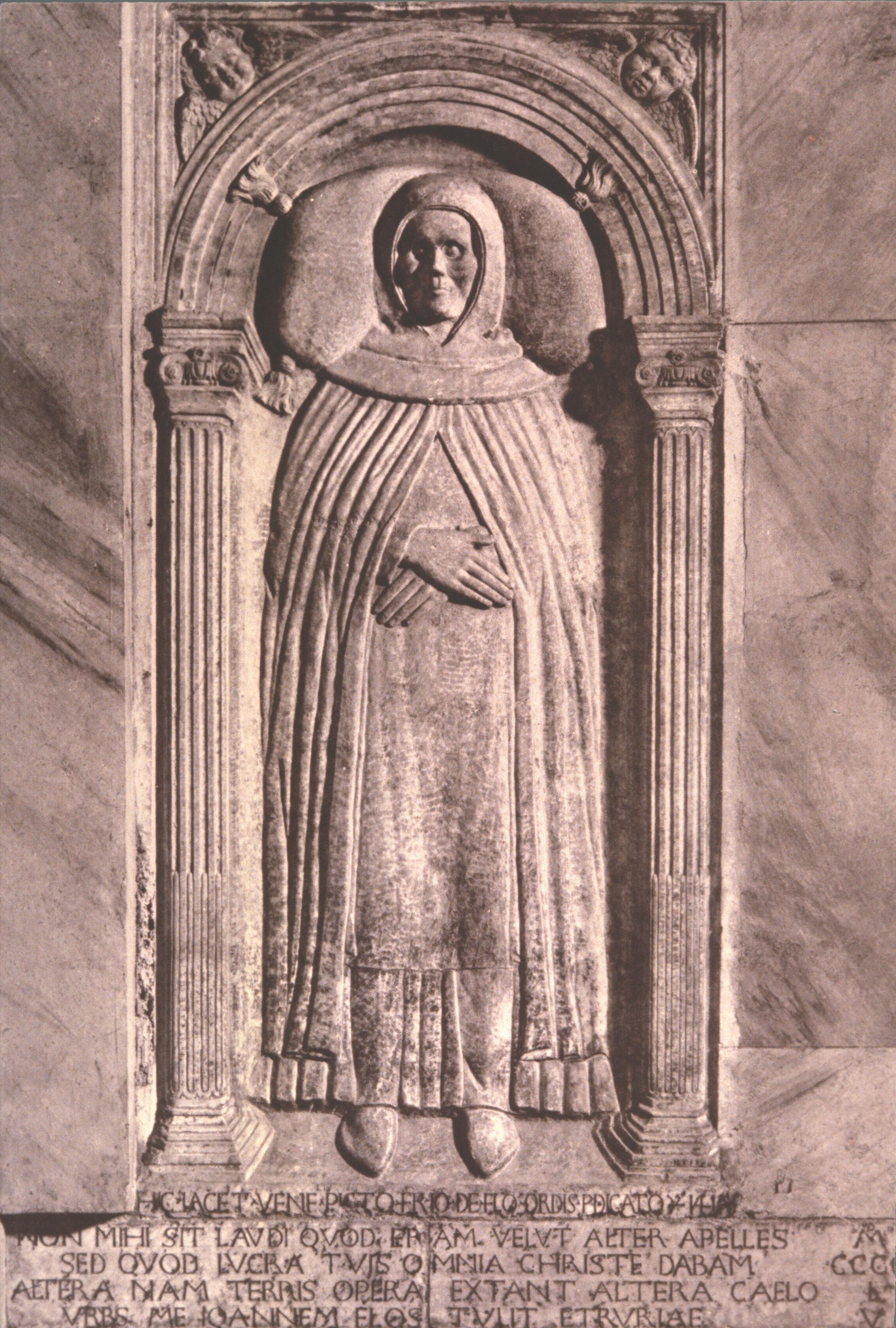 He remained in Rome under Eugenius’s successor and between 1448 and 1450, he frescoed for the new Pope a personal chapel with the stories we shall study in the final part of this lecture). He was back in Florence as prior of St Mark’s from 1450–52. But it was in Rome that he died in 1455; and it is there you will find his tombstone (fig. 24), showing him in his friar’s habit.