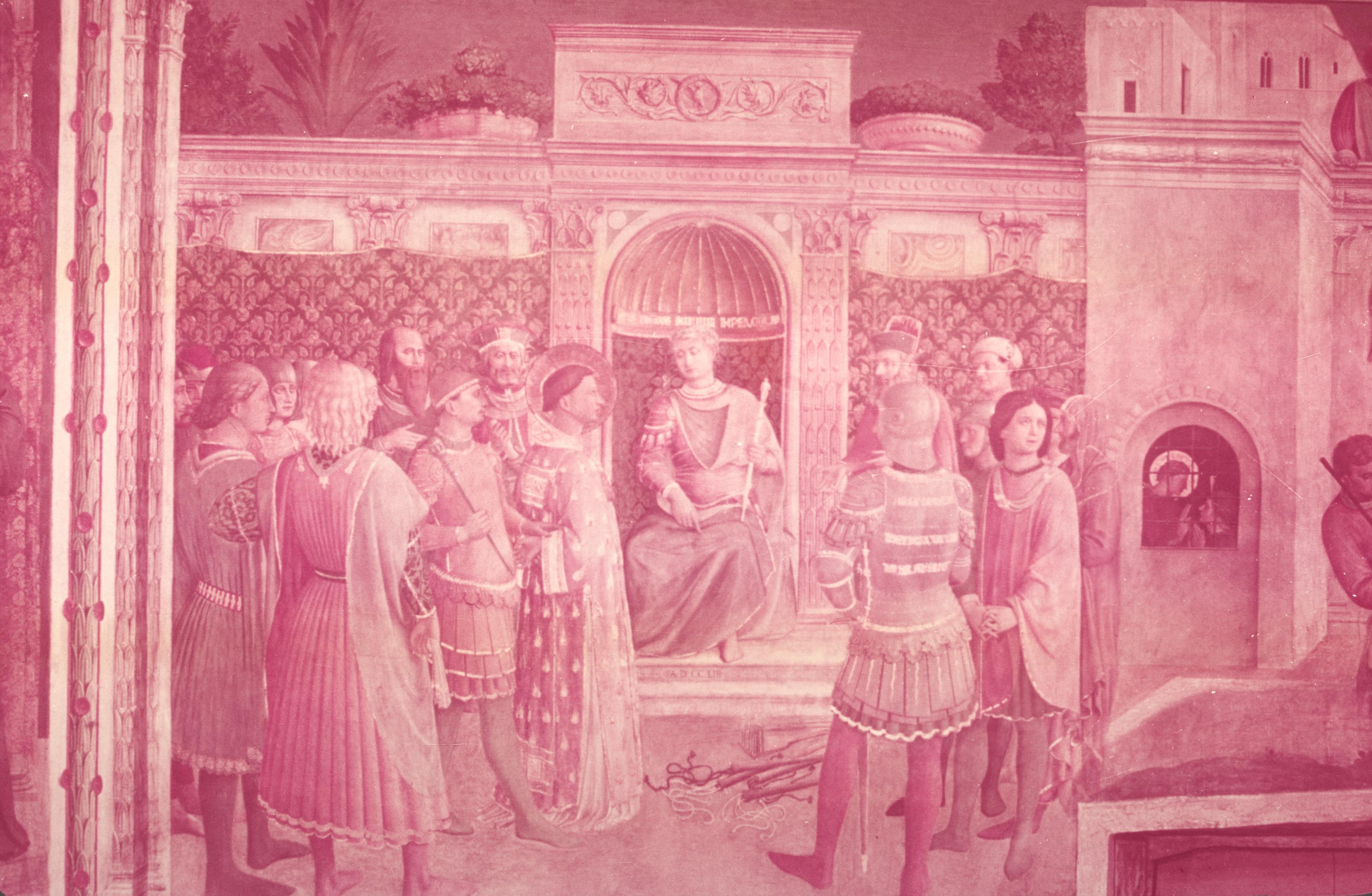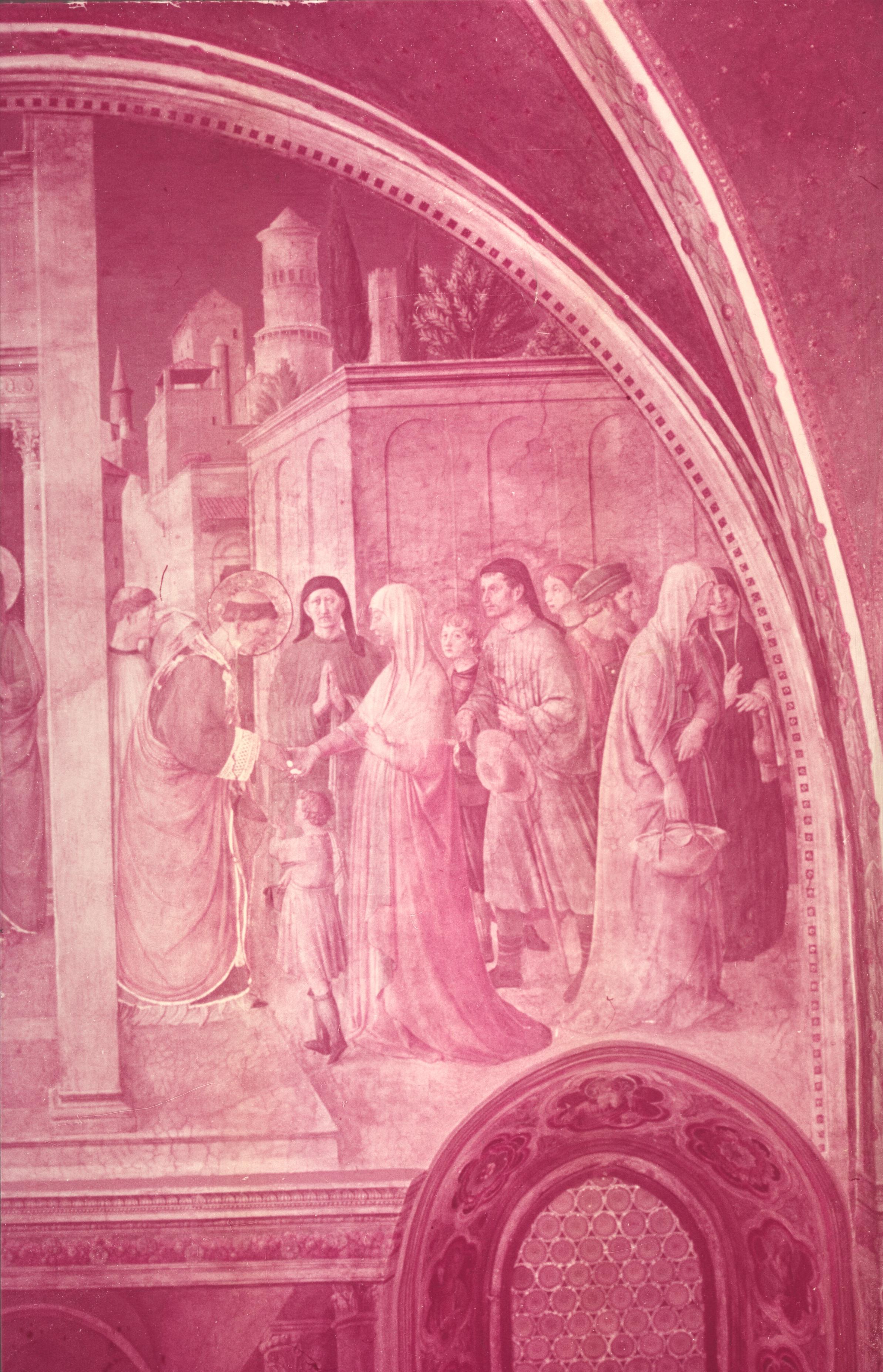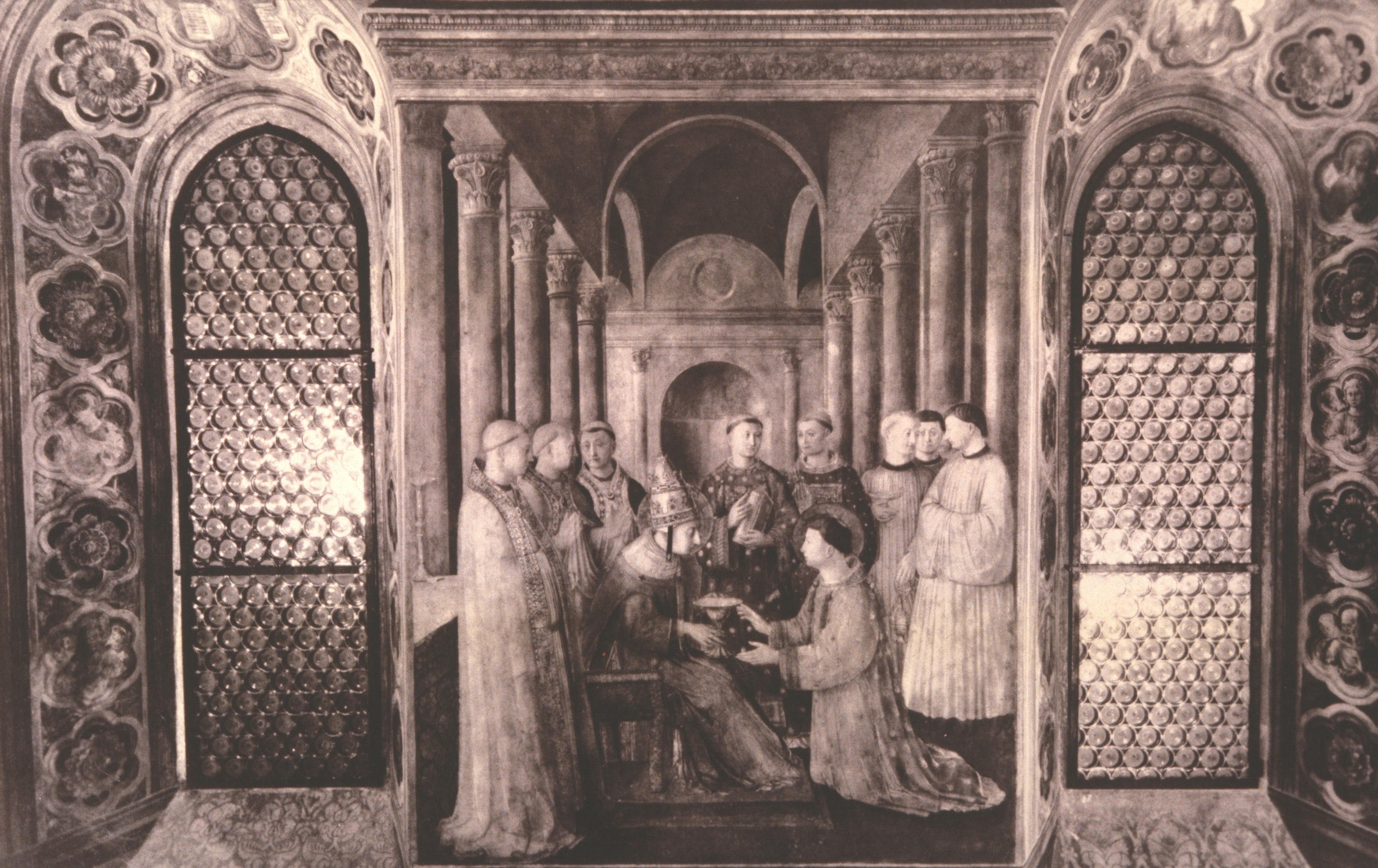 The first scene (letter D in the diagram in fig. 25), is placed between two real windows, as you can see in the above black and white image of the whole wall in fig. 36. It lies immediately below the scene of Stephen’s ordination by Peter, and the fresco (fig. 36) measures ten feet high by seven and a half feet wide: