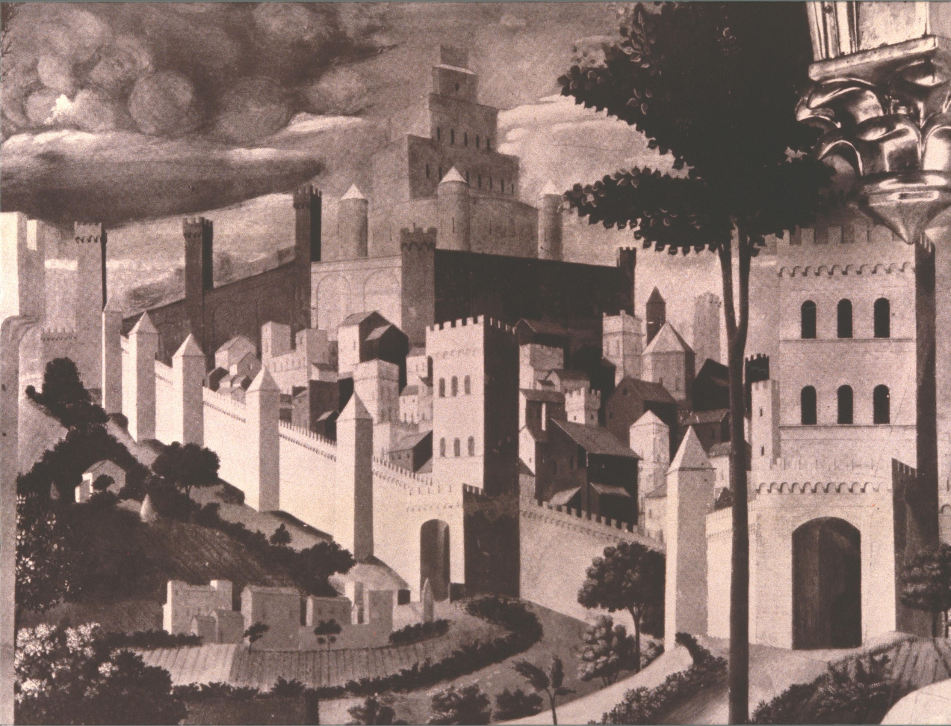Very striking is the command of depth in the landscape, as for example in the detail in fig. 3, where up-to-date perspective is used to create simplified buildings and walls (almost like a wooden model of a city) which stretch far into the distance under the dark cloud. Elsewhere, (cf. fig. 4a) the landscape of brown hills becomes blue in the distance, and is dotted with little villas and farms just like the hills round Florence. The palm, too (fig. 4b) is modelled by light exactly as if it were a column with a slightly more elaborate capital; and the individual leaves of the neighbouring tree catch the sunlight at different angles.