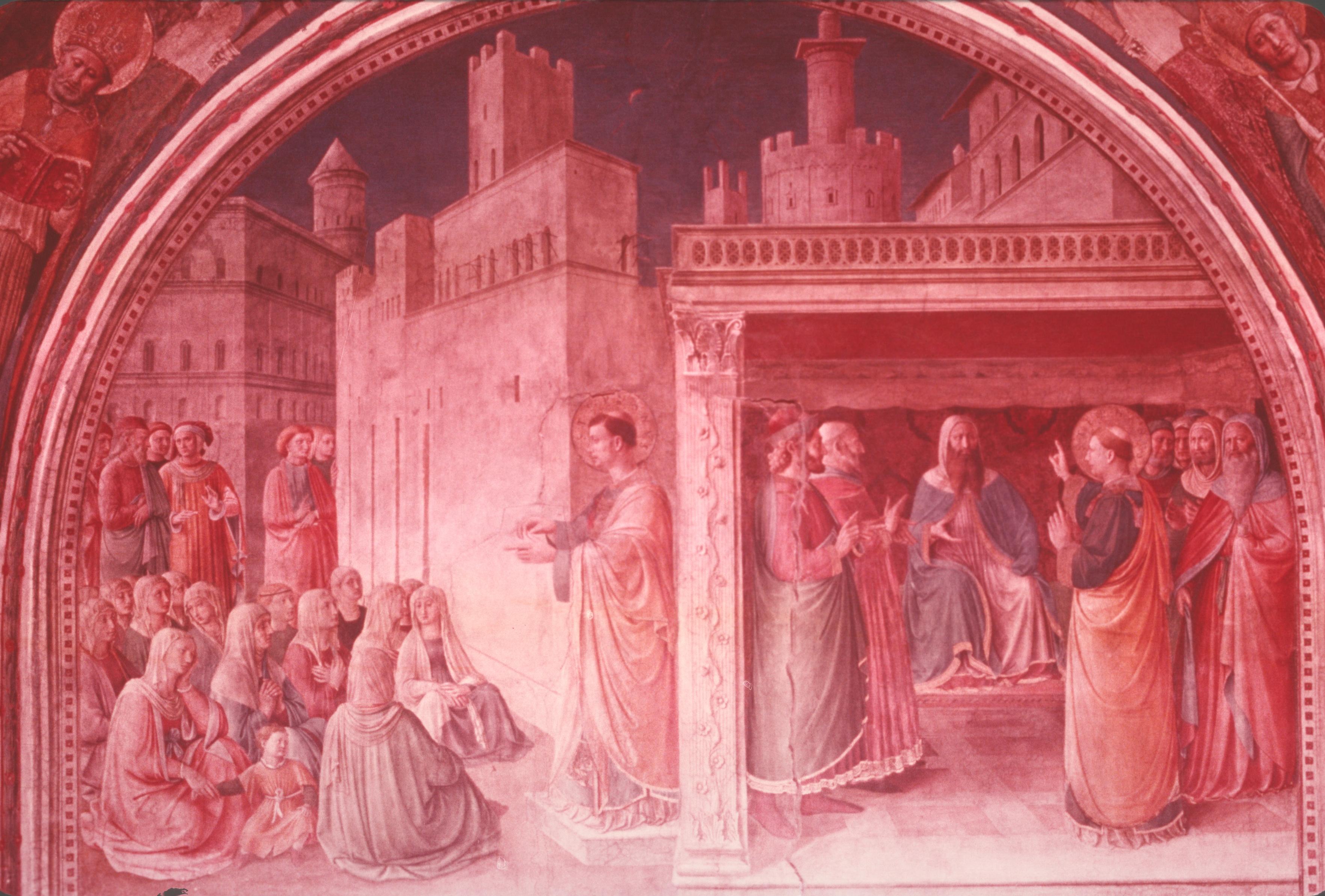 With this minimum of context, let us look at the lunette marked A (fig. 26 a) and in particular at the left half of the lunette (fig. 26 b), which illustrates the beginning of the story of Stephen as told in chapter six of the Acts of the Apostles, which is paraphrased in the Golden Legend as follows: