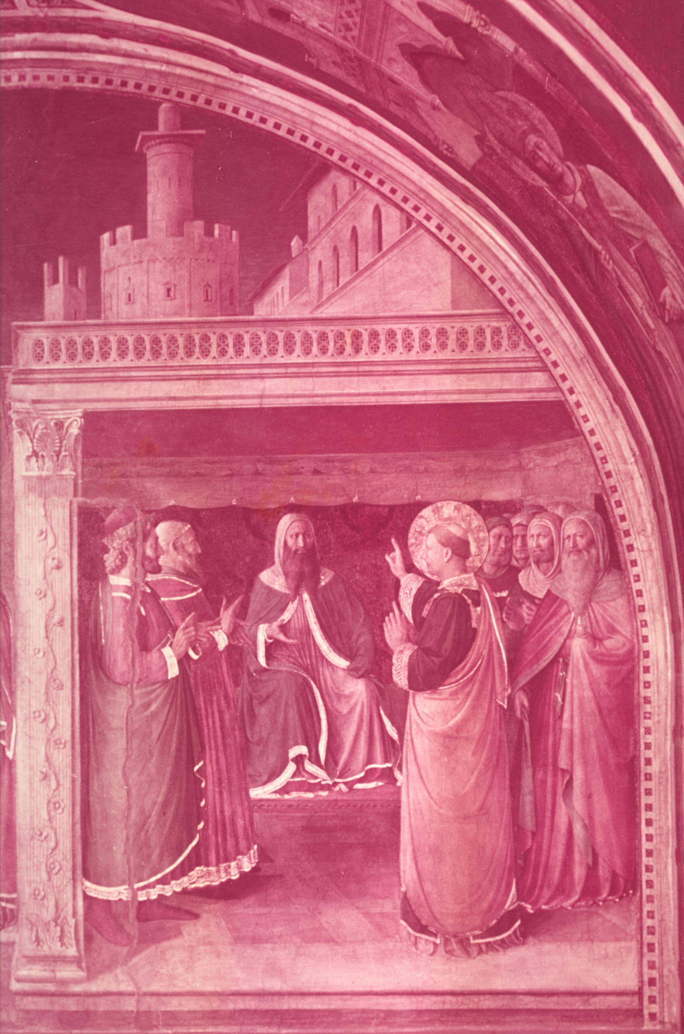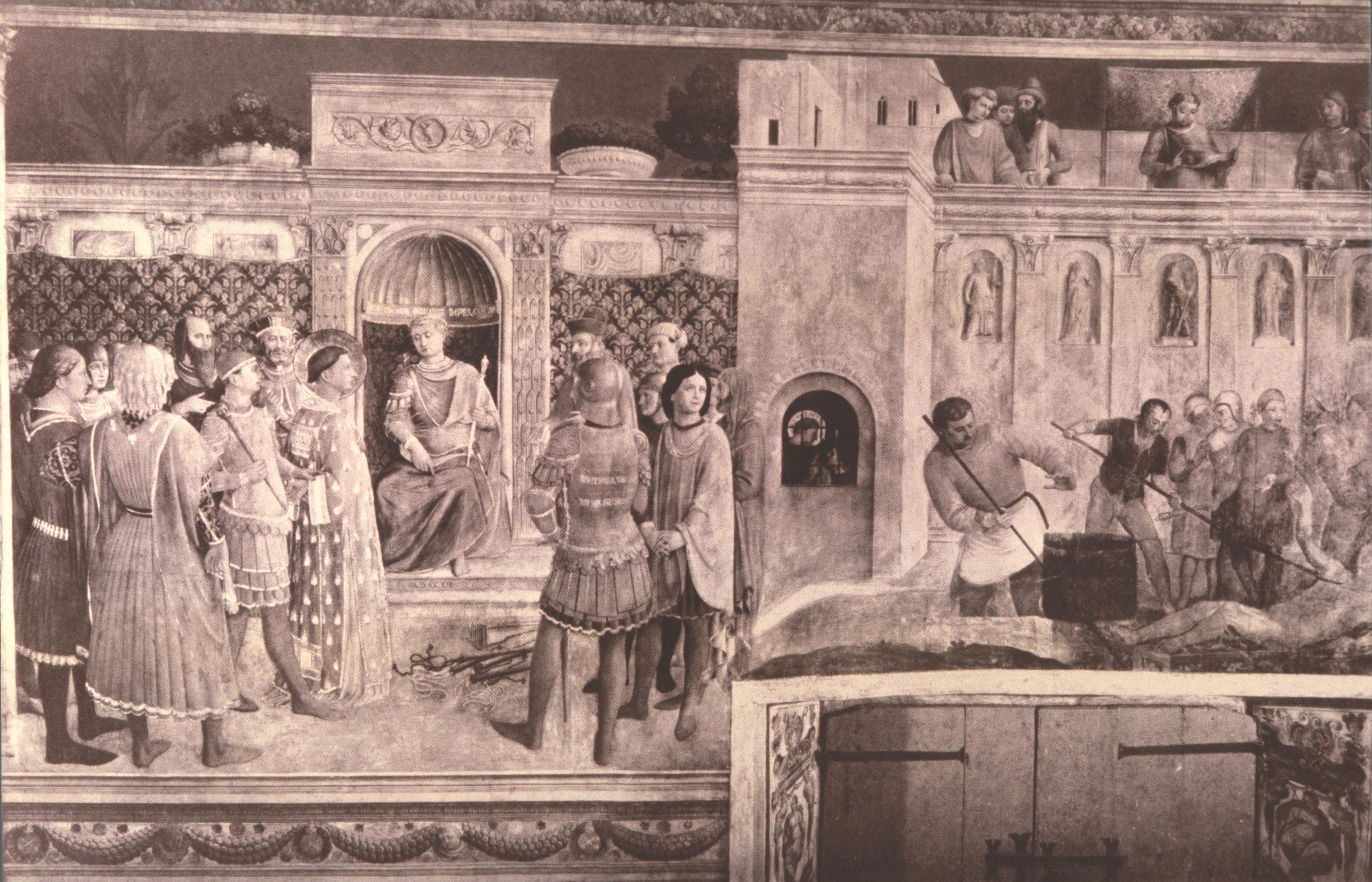 There is an architectural rhyme between the frame of this scene and the one immediately above (Stephen before the Sanhedrin in fig. 25); and there may also be a rhyme between the figures of Stephen before the high priest and of Lawrence being examined by the emperor Decius, on the left in the third fresco (fig. 43) of the lower cycle: