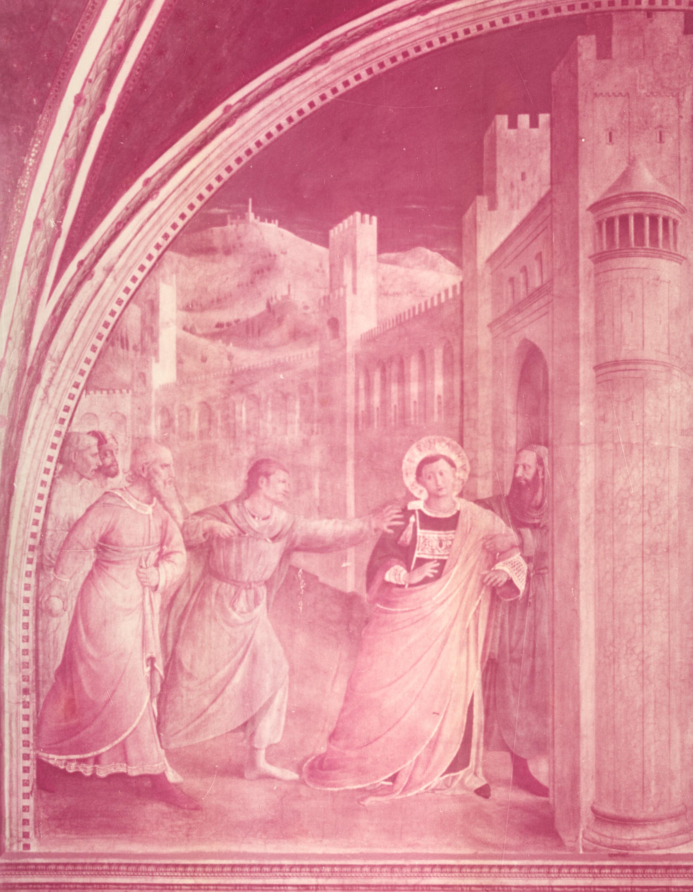The wall painted in the centre of the lunette acts as a scene-divider that can be interpreted as belonging to both episodes. Hence Stephen seems to reappear immediately on the outside step of the same church, taking part in a street scene which is one of the loveliest in all Giovanni’s work: notice the blind arcades on the high garden wall, and the exotic, Eastern towers in the narrow street which convey the information that we are in Jerusalem.