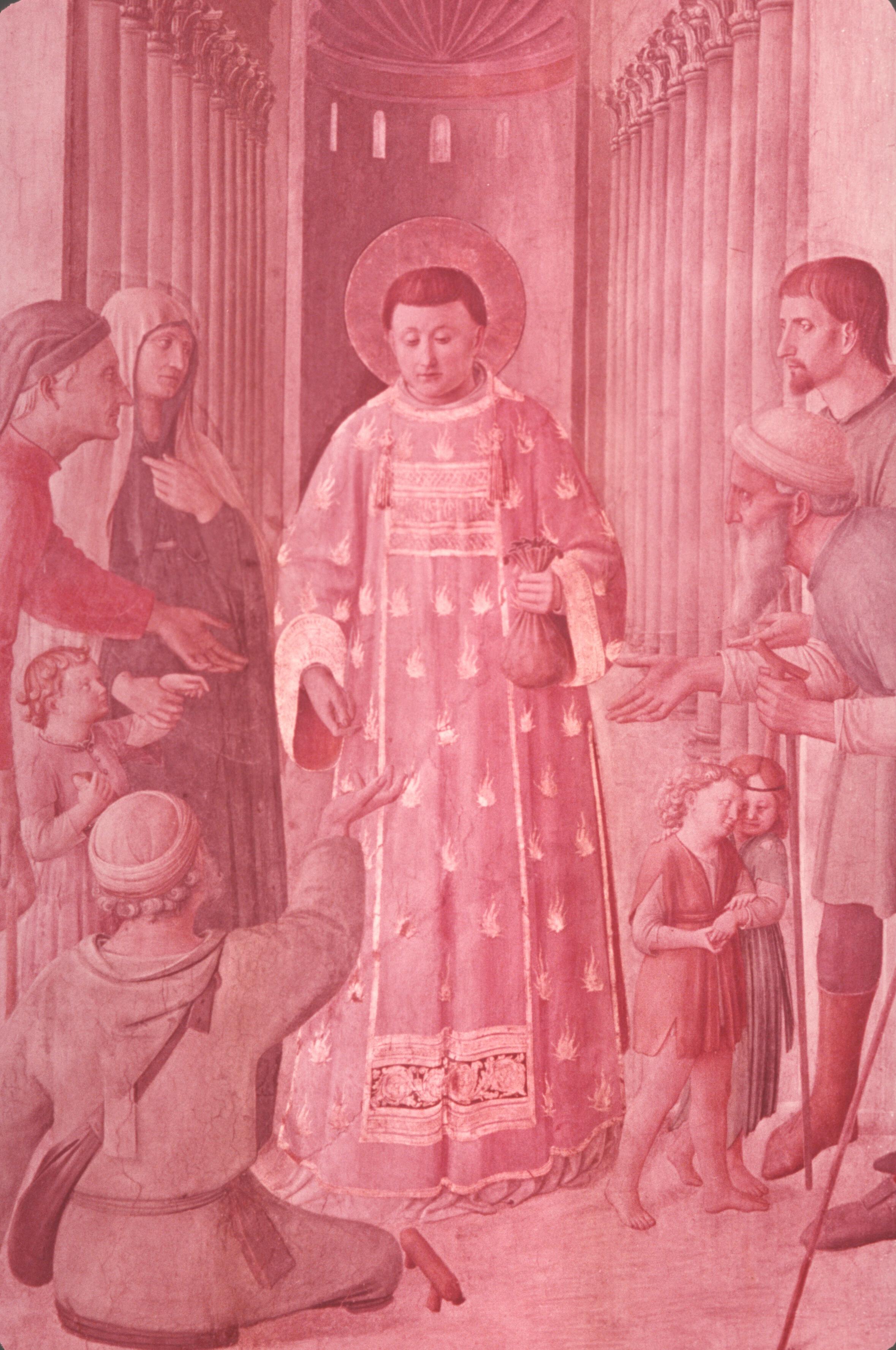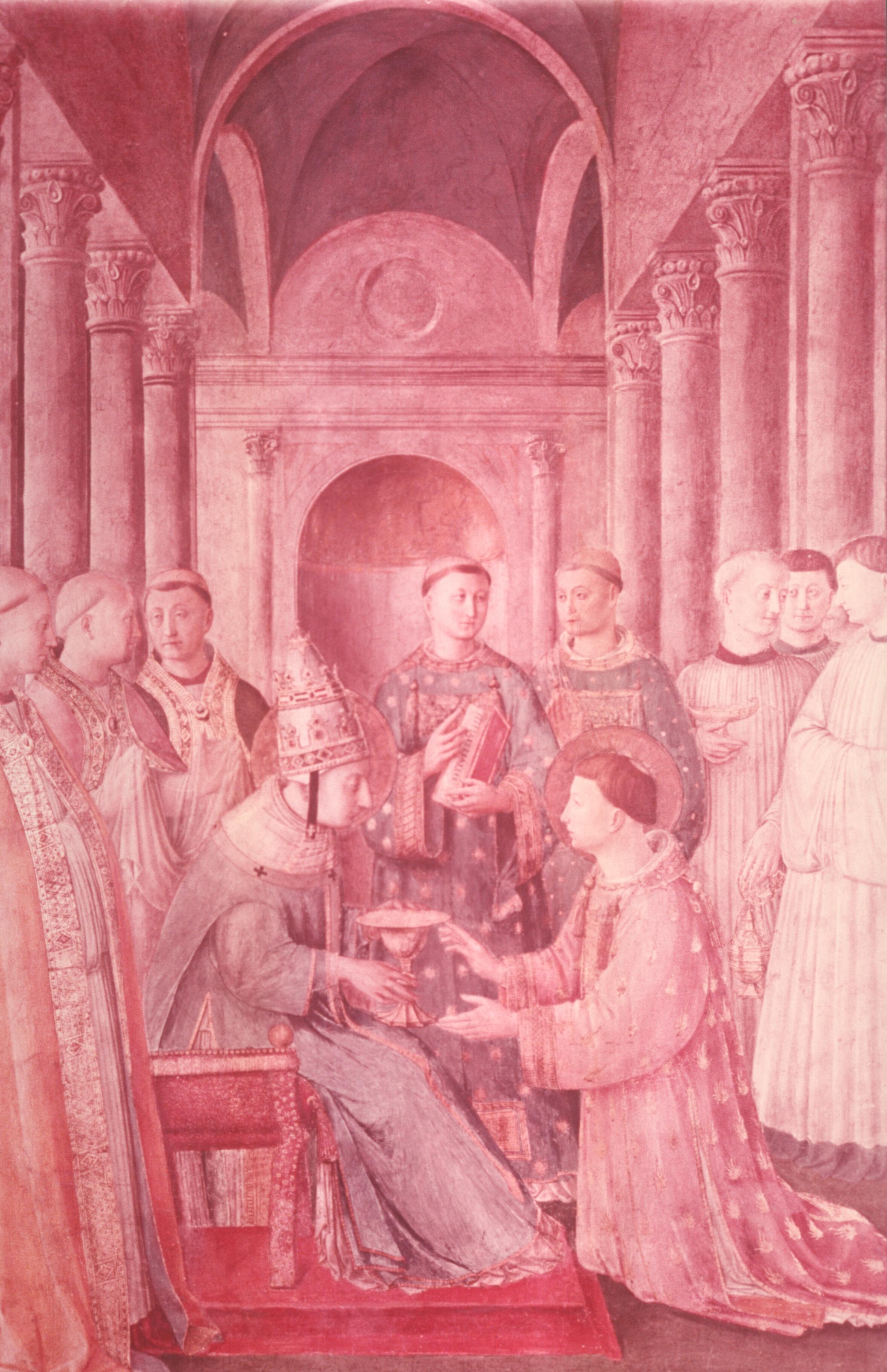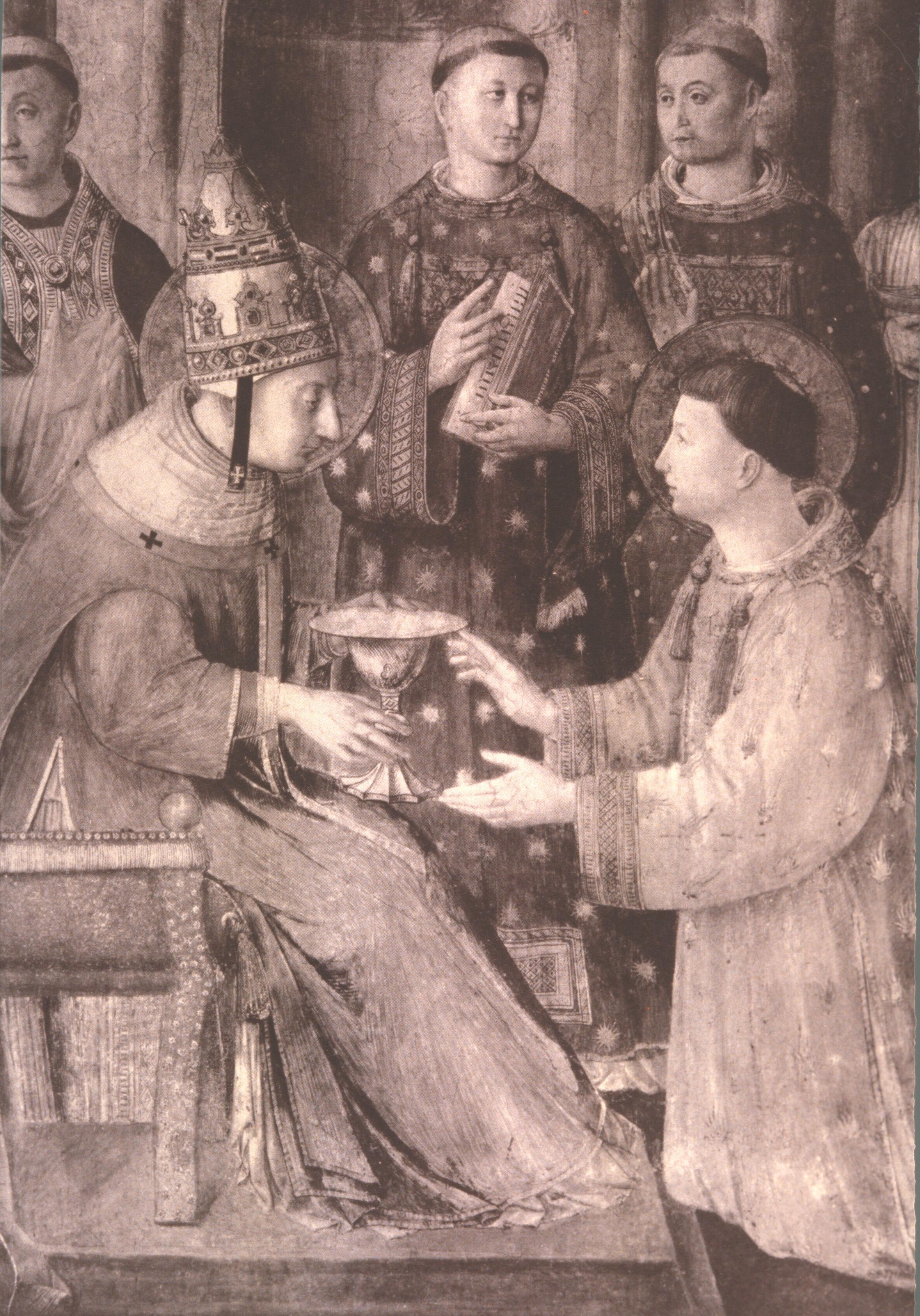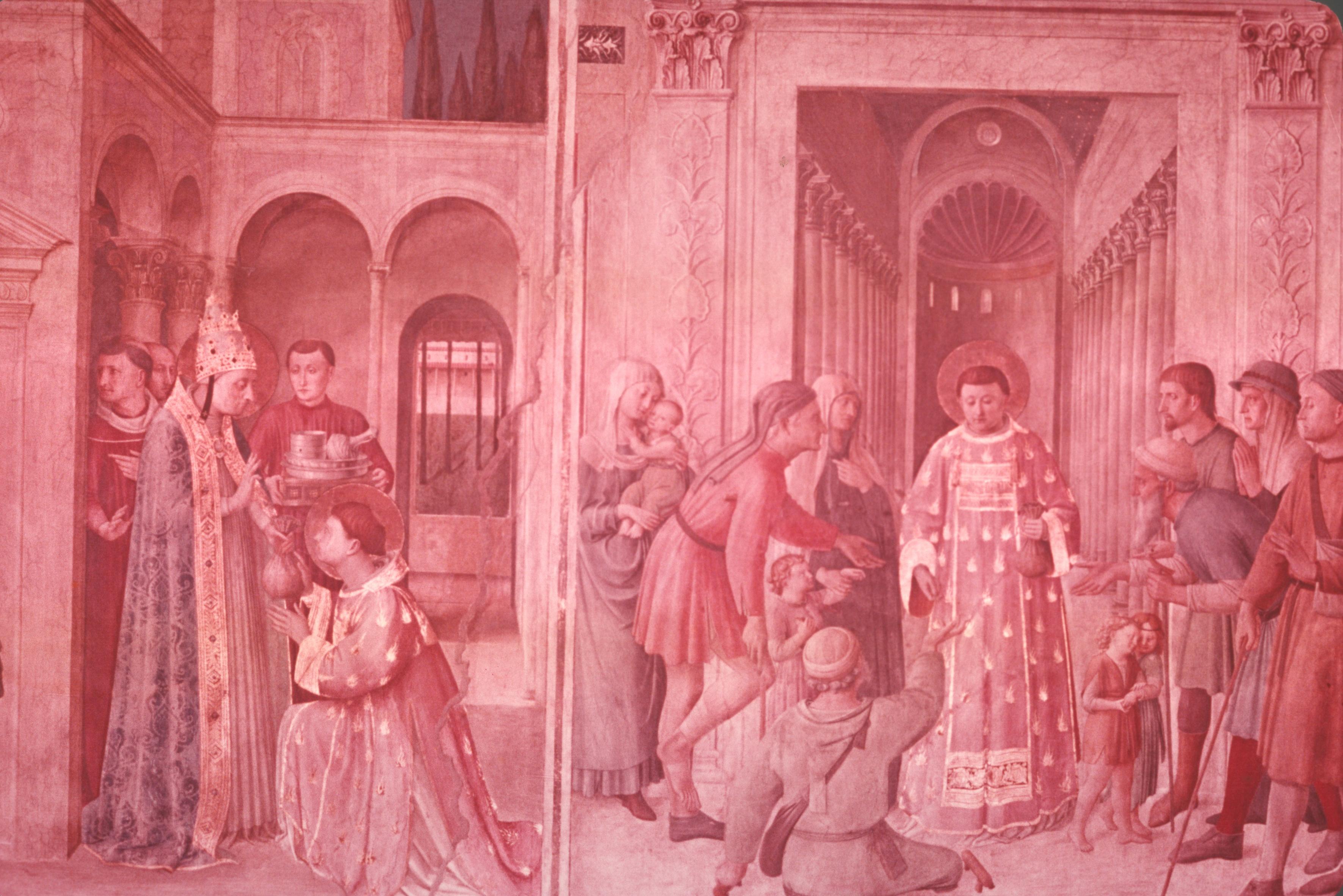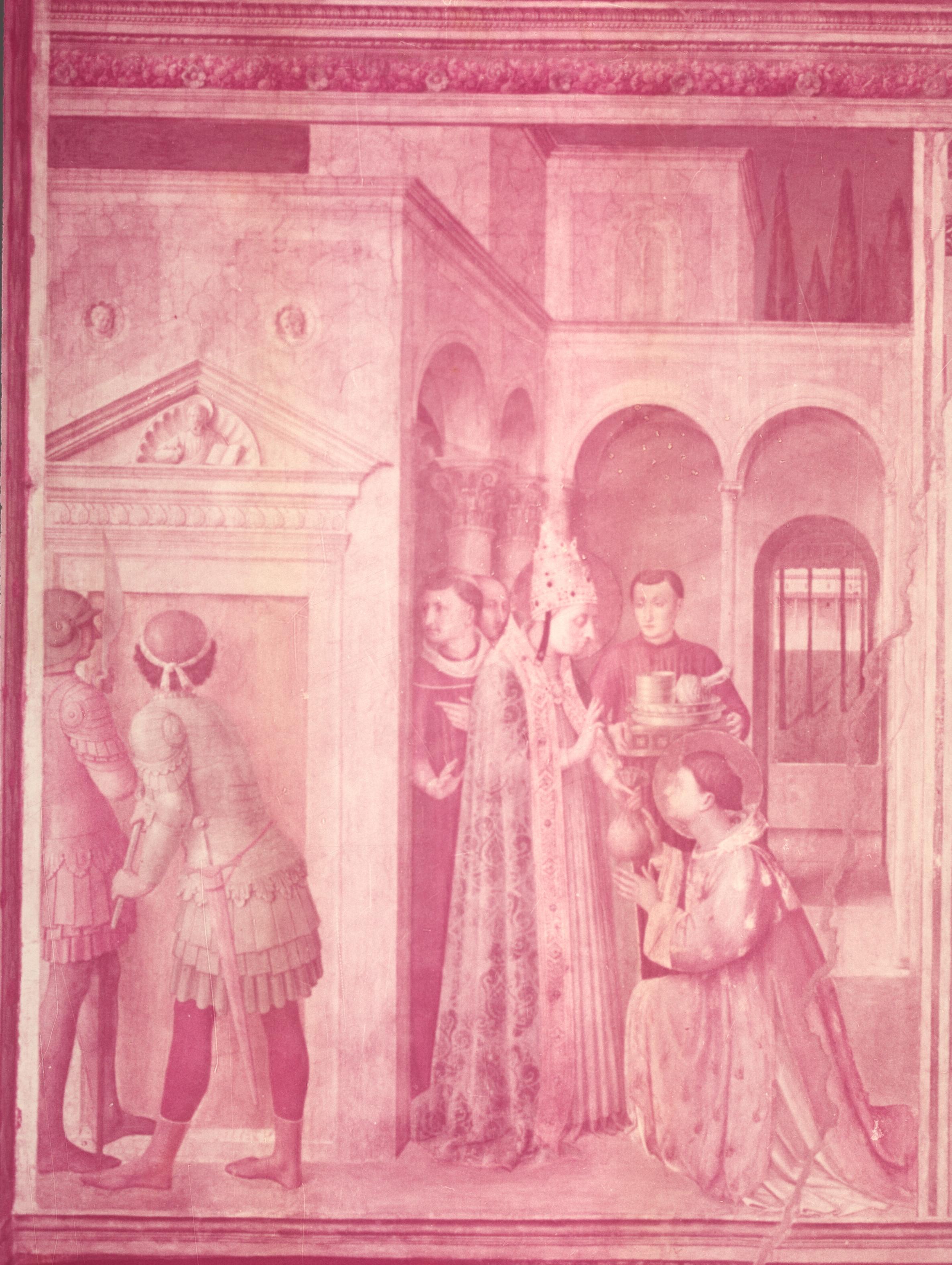 Inside the courtyard, Pope Sixtus—again wearing his tiara, and again with the features of Nicholas V (cf. fig. 40b)—entrusts to Lawrence the treasures of the Church (represented by the vessels) and the treasures of the Emperor (represented by the money bag), so that the deacon may distribute them to the poor, and thereby save them from the hands of the usurper.
