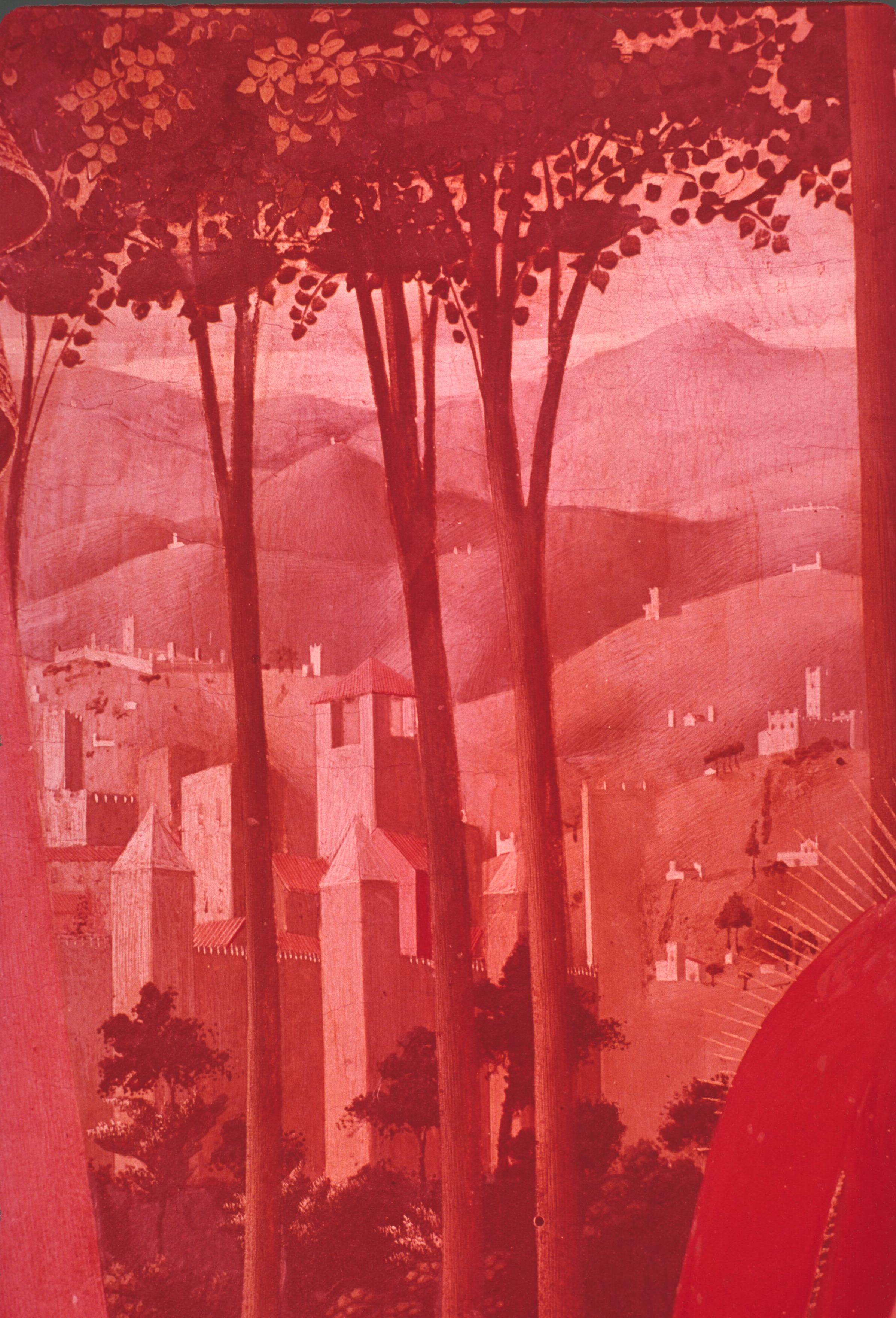 With the next panel, again forming a pair with its predecessor, we would have come to the right-hand end of the predella. Once again, there is a contrast between a patch of open sky and the unadorned buildings. These are typical of many a small hill town in Tuscany, and are painted with a perspective that creates quite a lot of space in the piazza (but not enough), and hints at a good deal more space behind, thanks to the four receding cypresses in the cemetery next to the church.