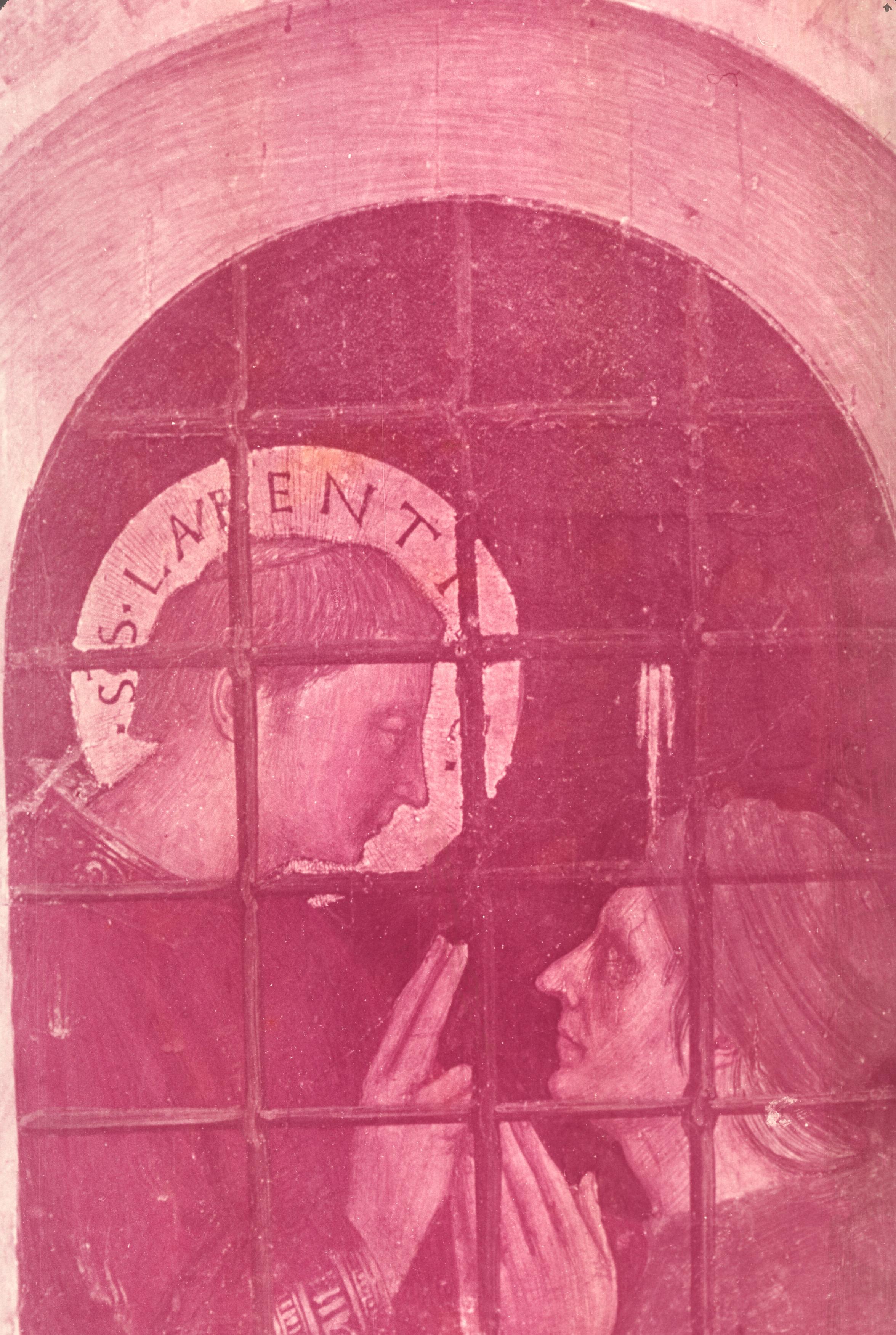 And it would take disproportionately long to tell the story behind the little scene in the prison window (cf. detail in fig. 45), where Lawrence, clearly labelled, is converting his jailer Hippolytus (whose face provides a lovely example of confident painting on fresh plaster. Incidentally, Hippolytus was also to suffer martrydom and his Feast was observed on August 14th, just four days after that of Lawrence).