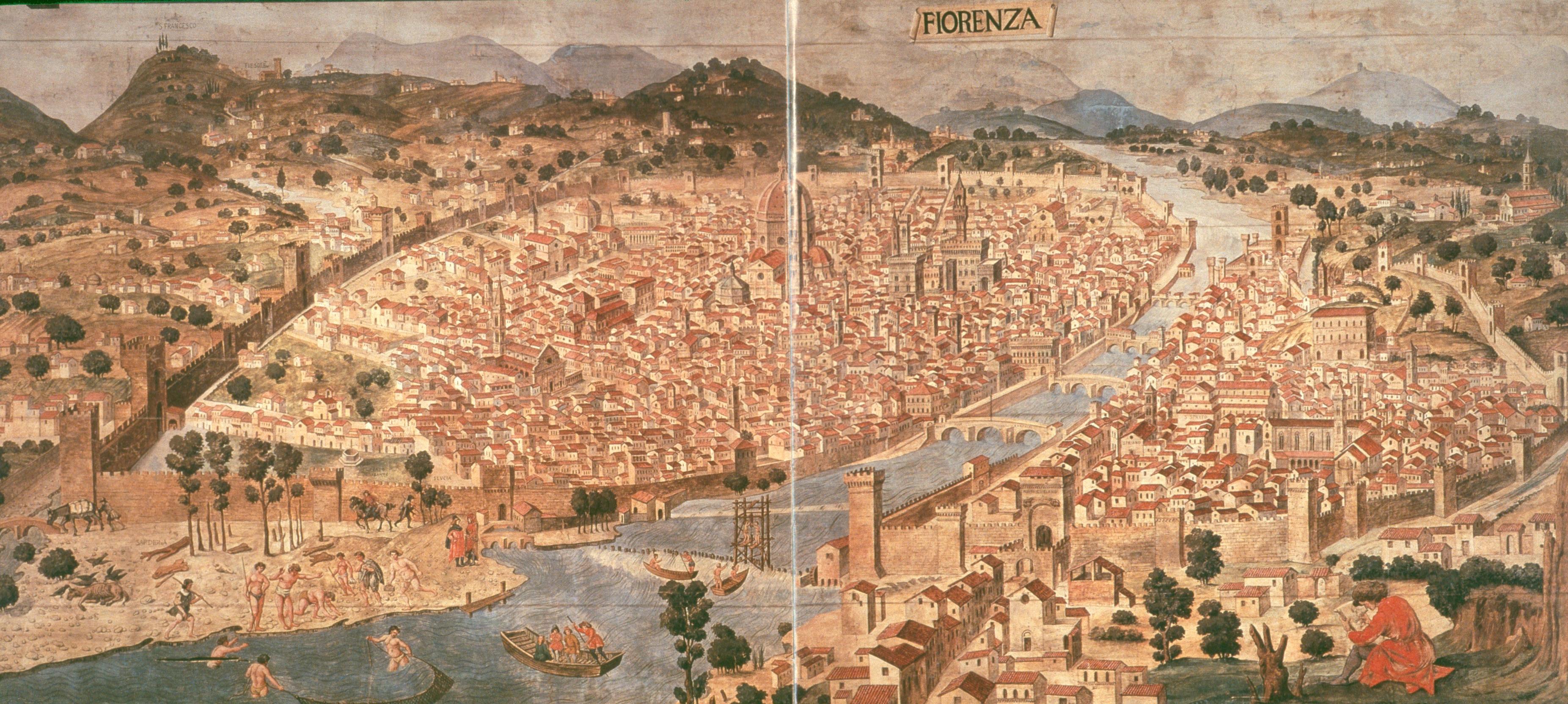 So much, then, for the first ten to fifteen years of Giovanni’s career, and the various commissions for guilds, neighbouring towns and a Franciscan church. The next phase in his career brought him from Fiesole to Florence—you see a view of the city in about 1470 in fig. 5—and his work was now done almost exclusively for his own Order, in response to the patronage and influence of one man, whose family lived in the quarter you see below, between Santa Maria Novella, the Cathedral and the gardens inside the city wall: