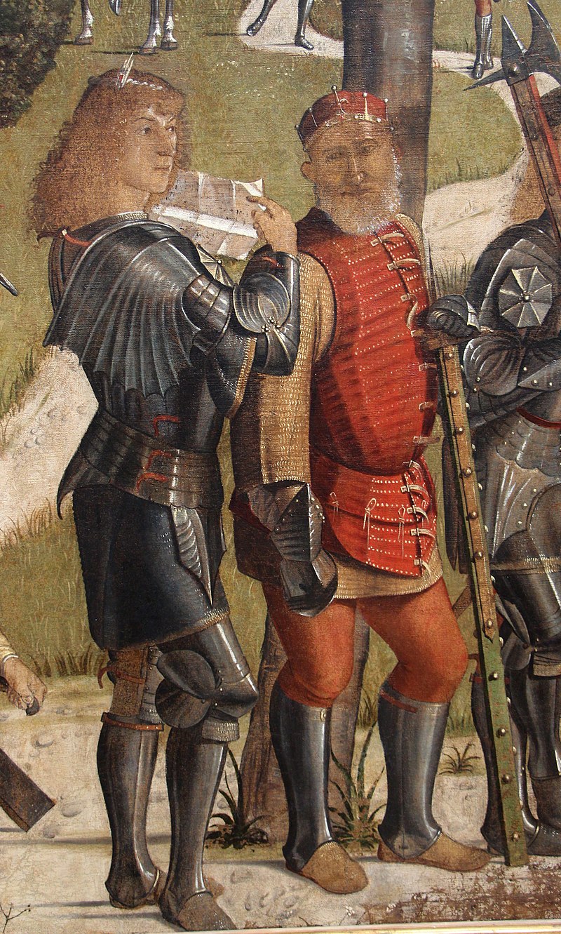 In this case, though, the human figures in the foreground are also particularly interesting. Ridolfi, writing in 1648 and usually well-informed, says that the kneeling men on the right are portraits of the Bellini clan: perhaps, Jacopo (portrayed posthumously), Gentile, Giovanni, son-in-law Mantegna, together with a grandson.
