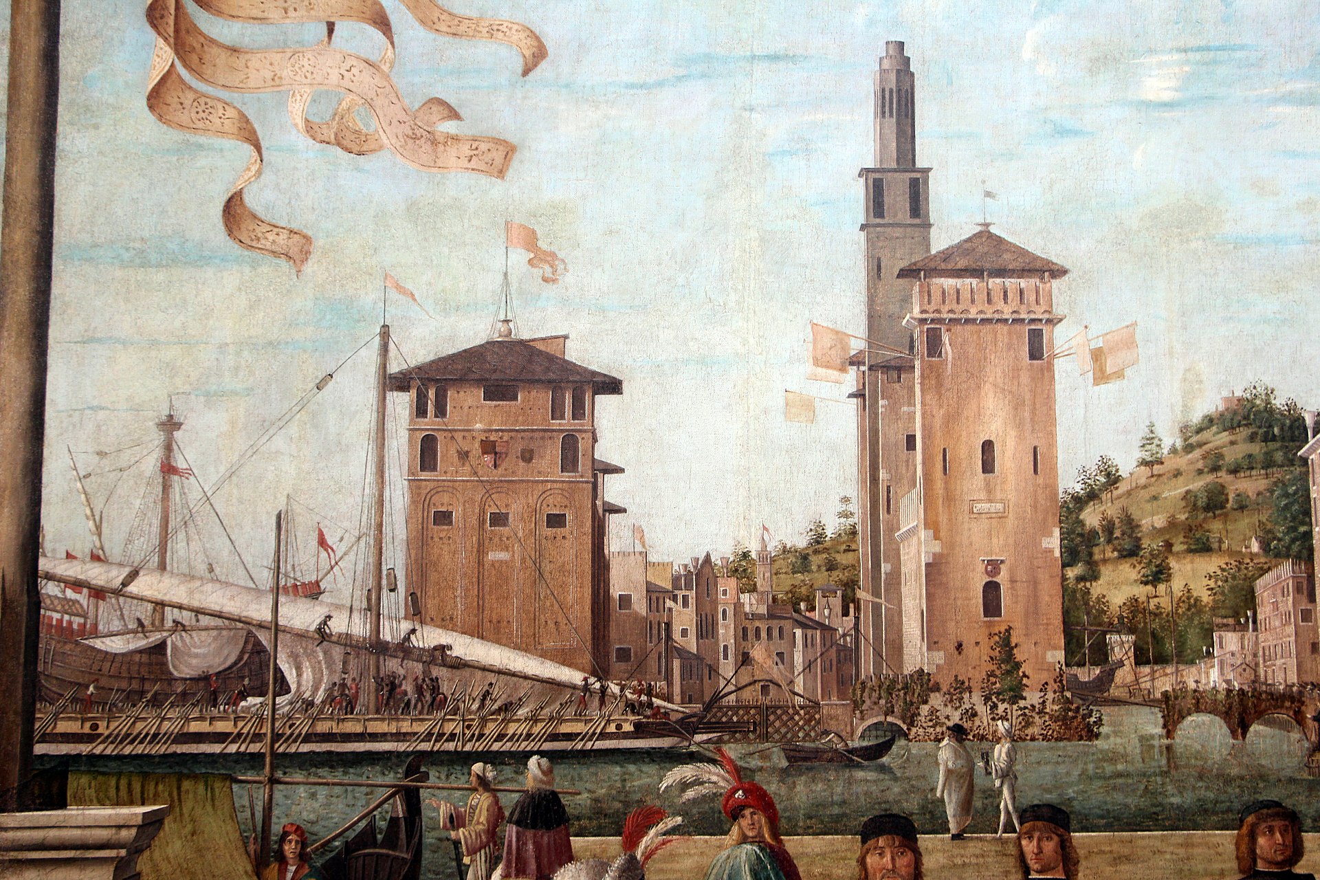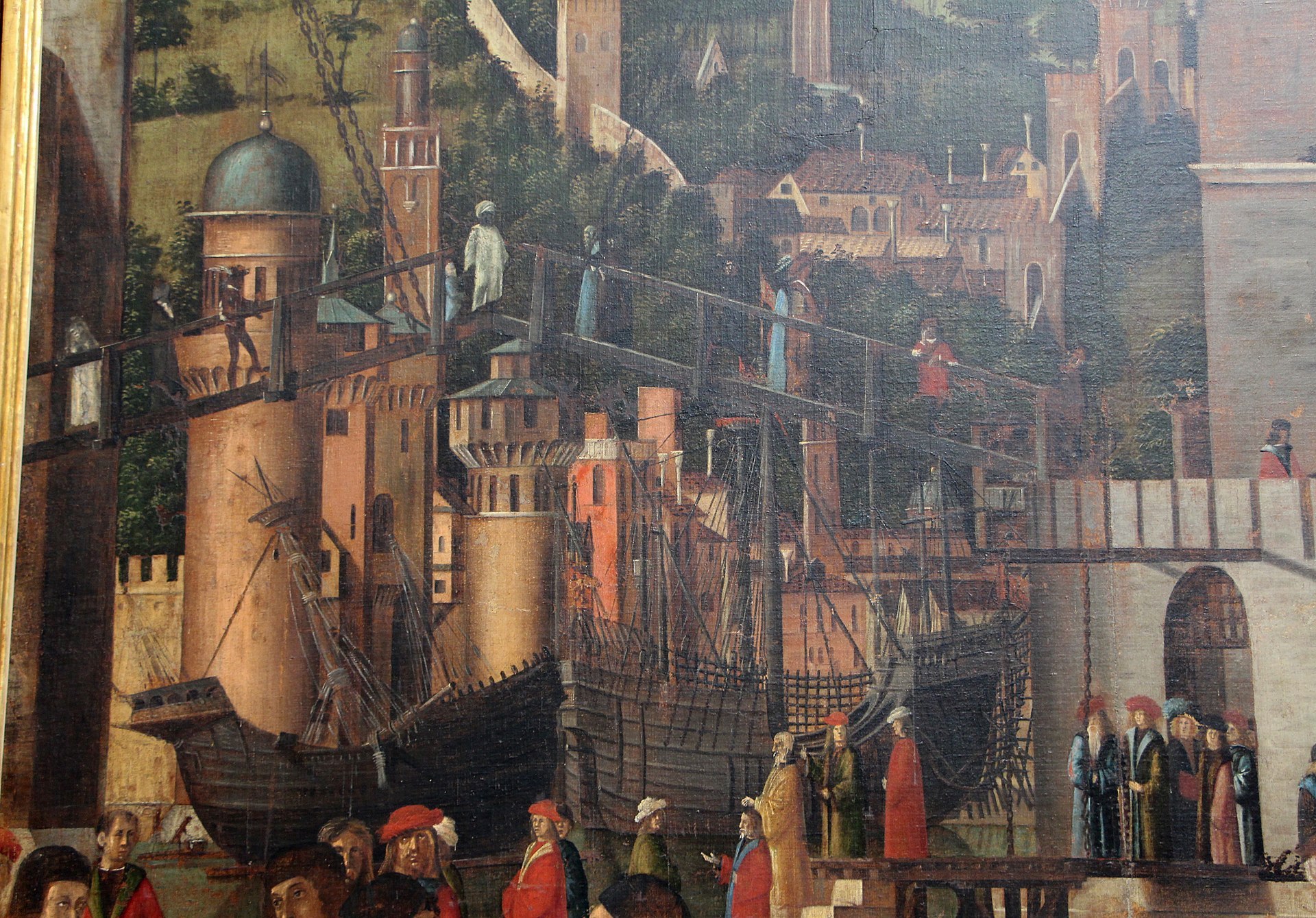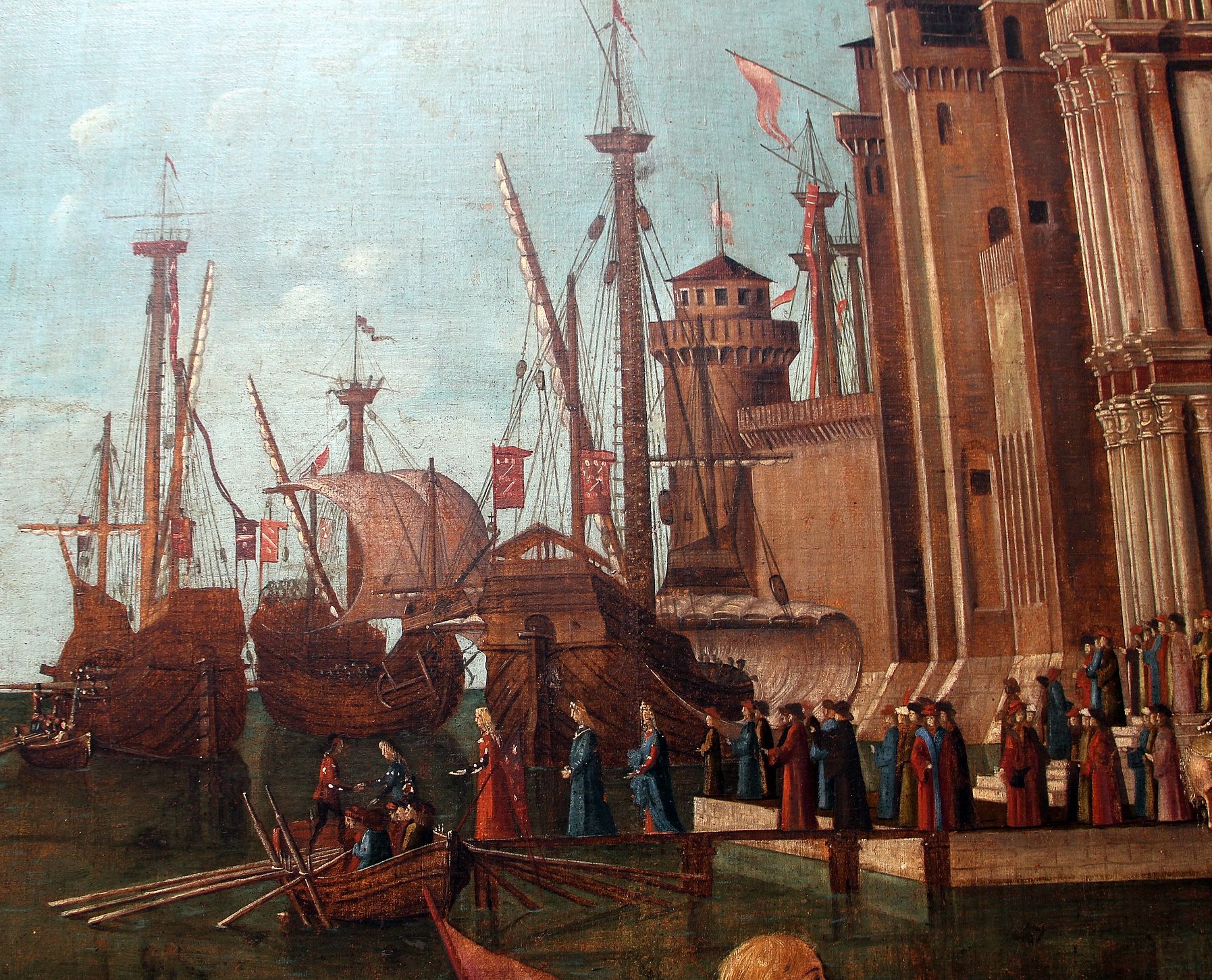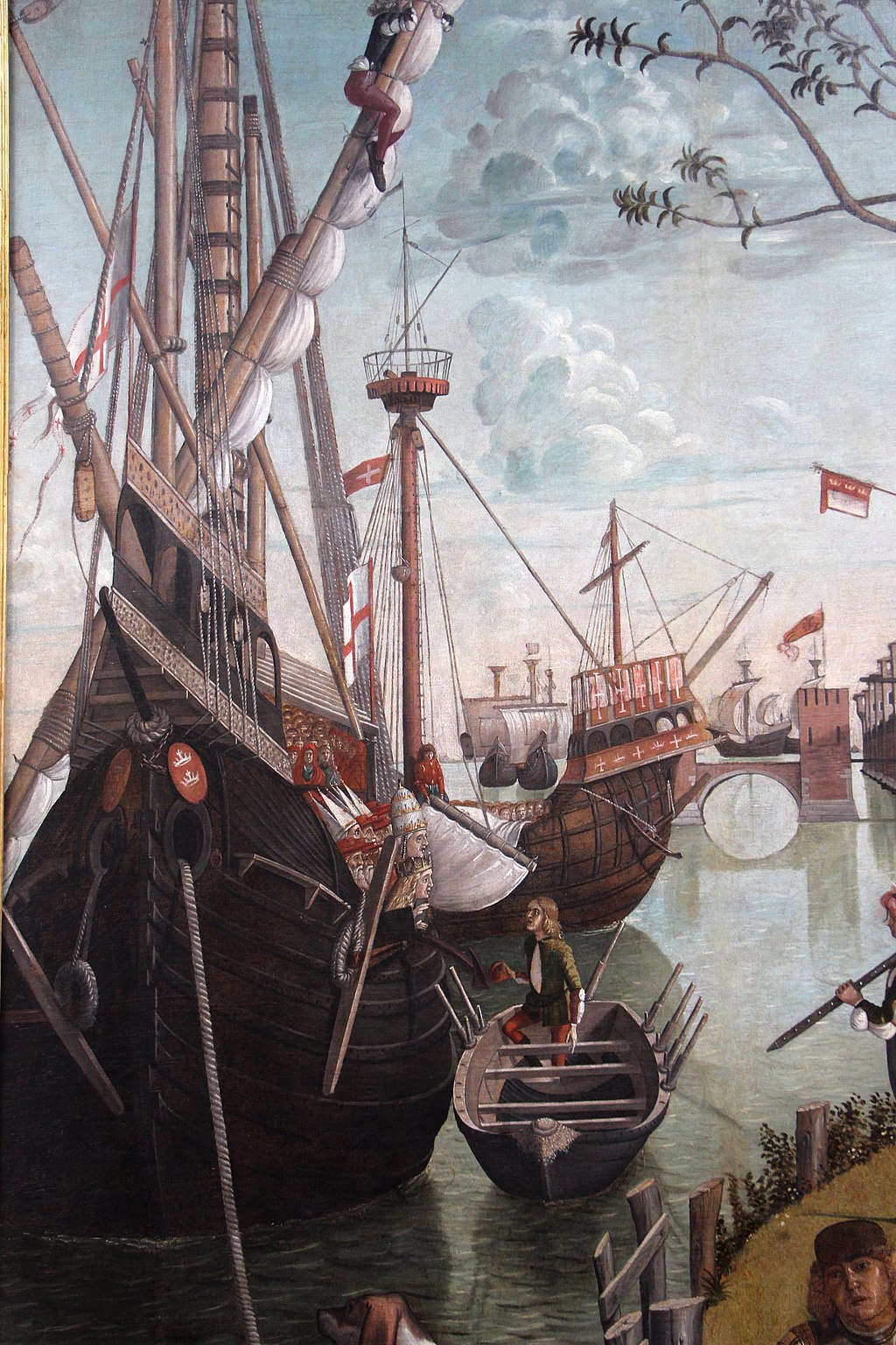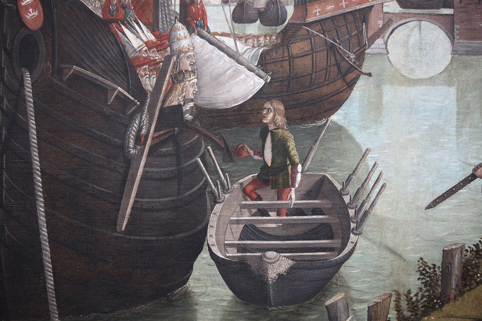 The river is therefore the Rhine, and on it we see the leading ships of the flotilla bearing the 11,000 virgins, sailing down towards the one that is already at anchor. The greatest charms of this rather uncertain composition are to be found in the play the light on the river (reflecting the arch of the bridge), in the details of the ship, (with anchor cable, bowsprit, sailor furling the sail), and the heads of Cyriacus and Ursula (who are ‘tiara-ed’ and ‘crowned’ respectively) who are seen in front of a huge cargo of cardinals in the hold amidships.