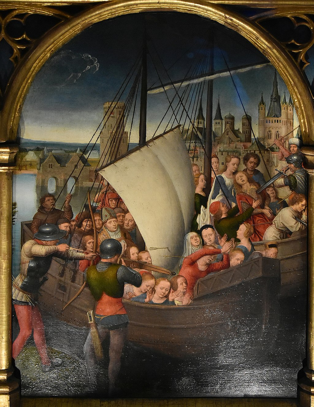 When Ursula and the 11,000 virgins set out from Rome on the return journey, they were accompanied by Cyriacus (who resigned the papacy) and a retinue of cardinals and bishops. You can see them clearly in the first panel on the second side of Memling’s reliquary (Figure 00 FIXME), where they are shown in front of the city gate of Basel, as they embark for the return journey down the Rhine towards Cologne: