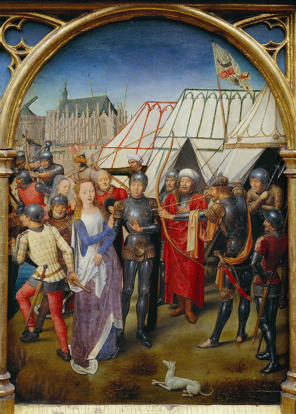 So the city is meant to be Cologne; and since the same flags fly over the city as over the tents of the besieging Huns, we may assume that the city has already been captured. In the foreground, we see (in red) the king of the Huns, Julian, identified by his crown, and a younger man, his son, who is reading from the letter despatched by the perfidious Maximus and Africanus. The impending violence is foreshadowed in the almost leafless tree with a solitary bird of prey perched on a branch