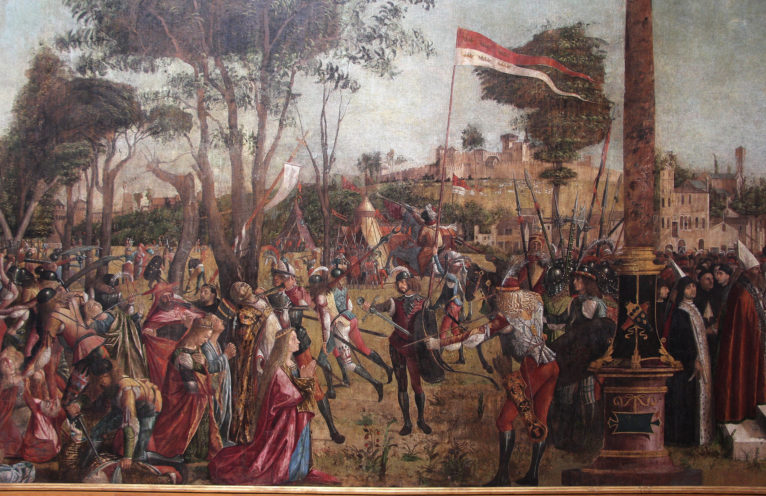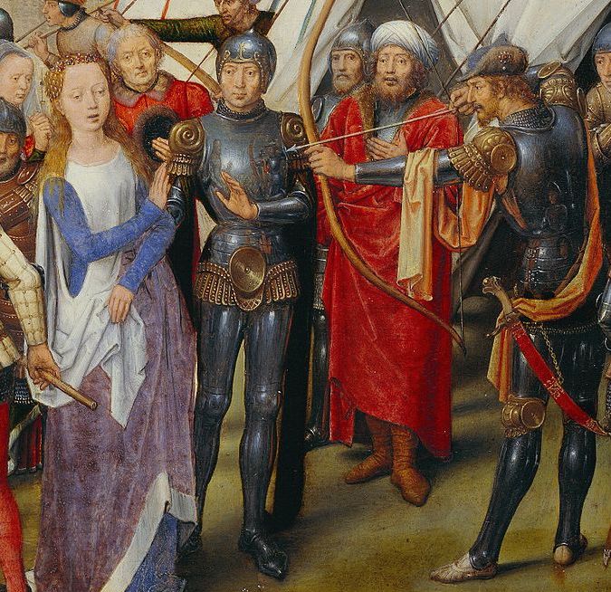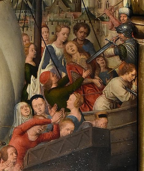 The detail in Figure 00 FIXME shows the saint and her betrothed supporting one of the virgins who has been stabbed by the fully-armoured Hun with his enormous broadsword.