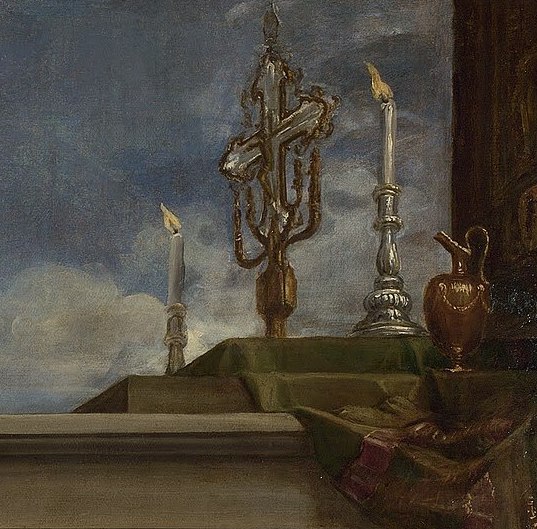 Opposite the altar wall in that original layout—now it is on the right of the altar–there probably lay the following canvas (Figure 00 FIXME), which is the same height but fully ten feet wide, and was almost certainly wider still originally, since it seems to have been cut down on the left (the vanishing point of the perspective having probably been in the centre):