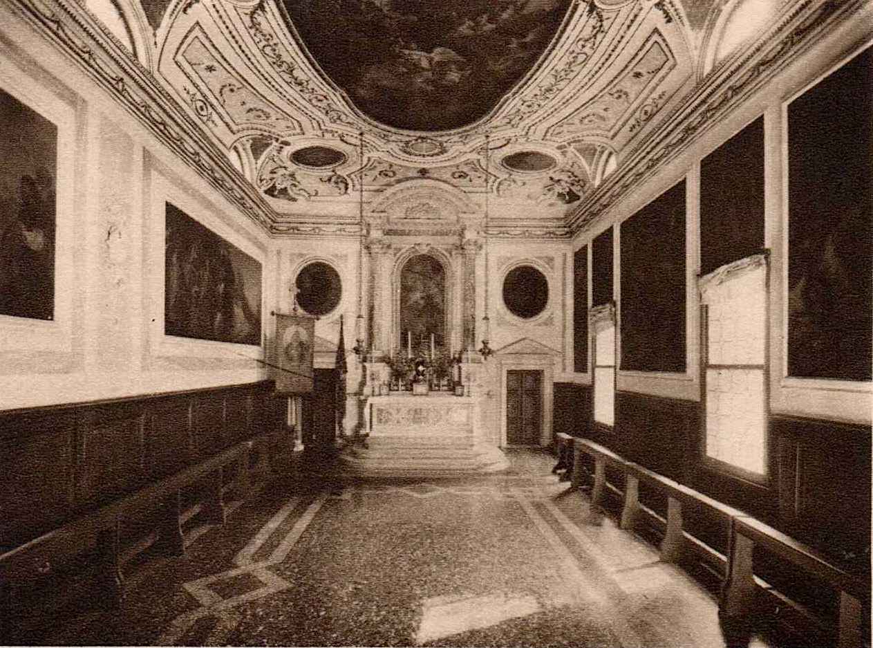 The building was about 40 feet wide and about 65 feet long on the canal side. Notice that it had a pitched roof, with a rose-window flanked by two Gothic windows, and square grilled windows on either side of the door; it also had two stories, the ground floor being the Oratory, and the upper floor the Sala dell’albergo.