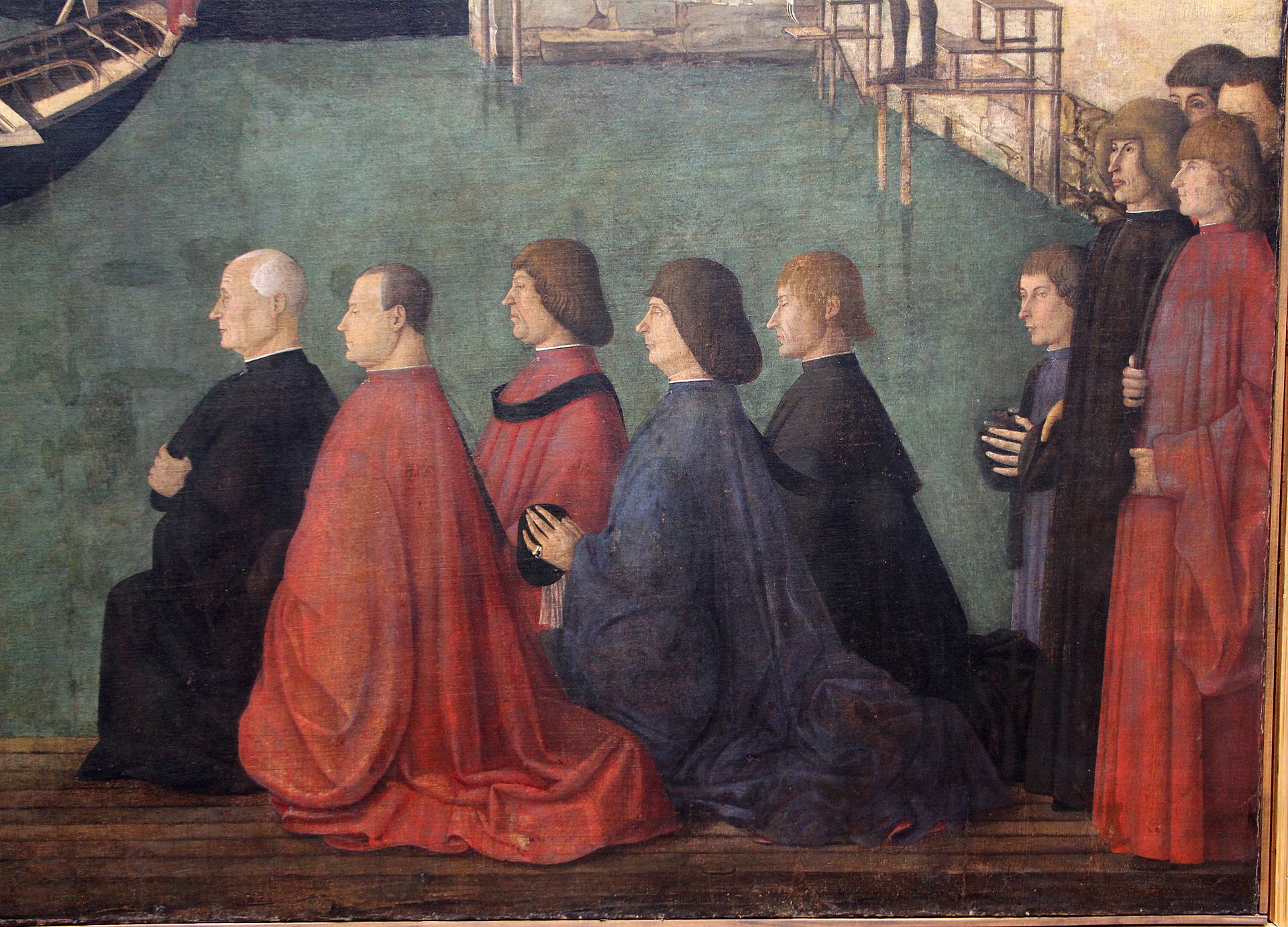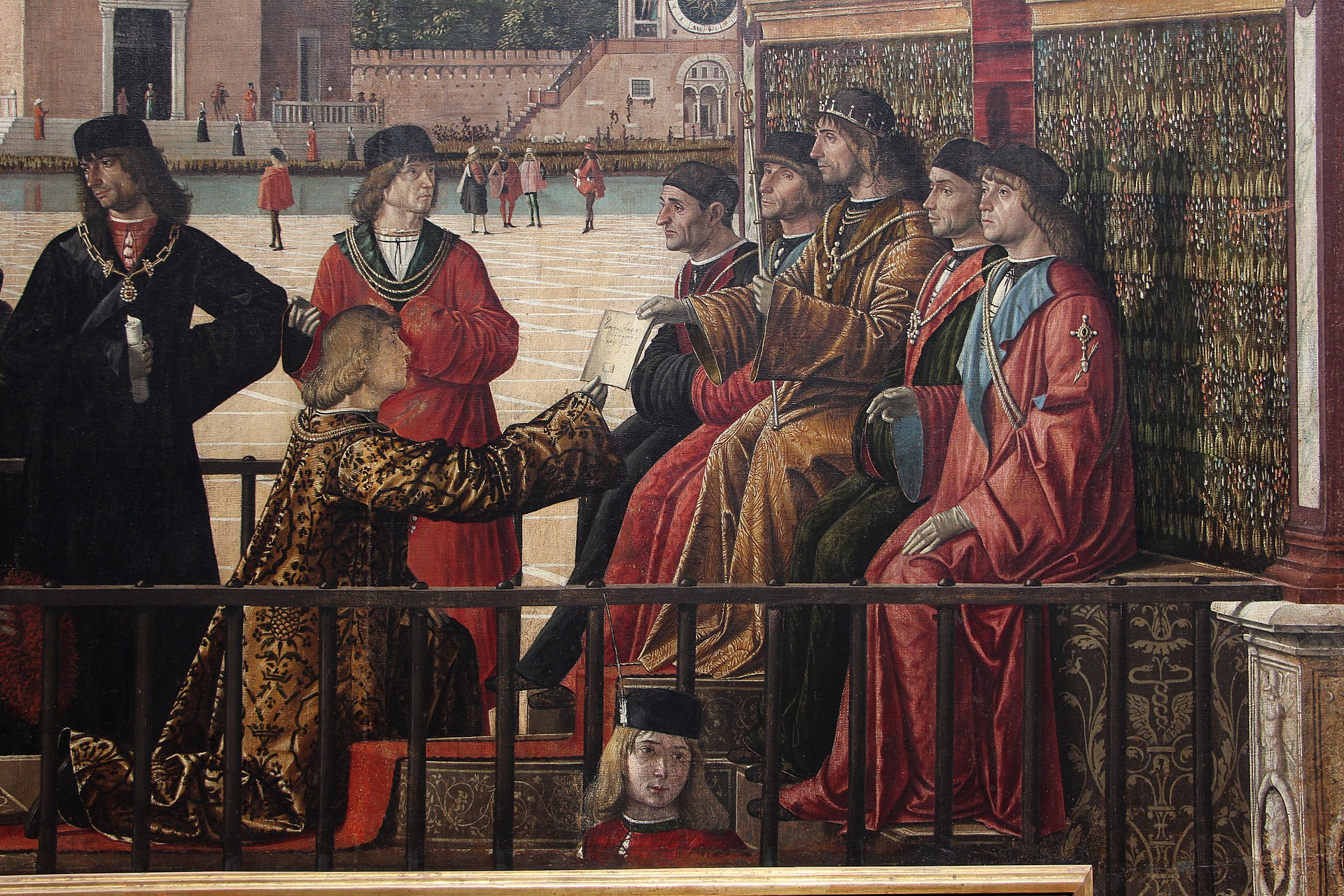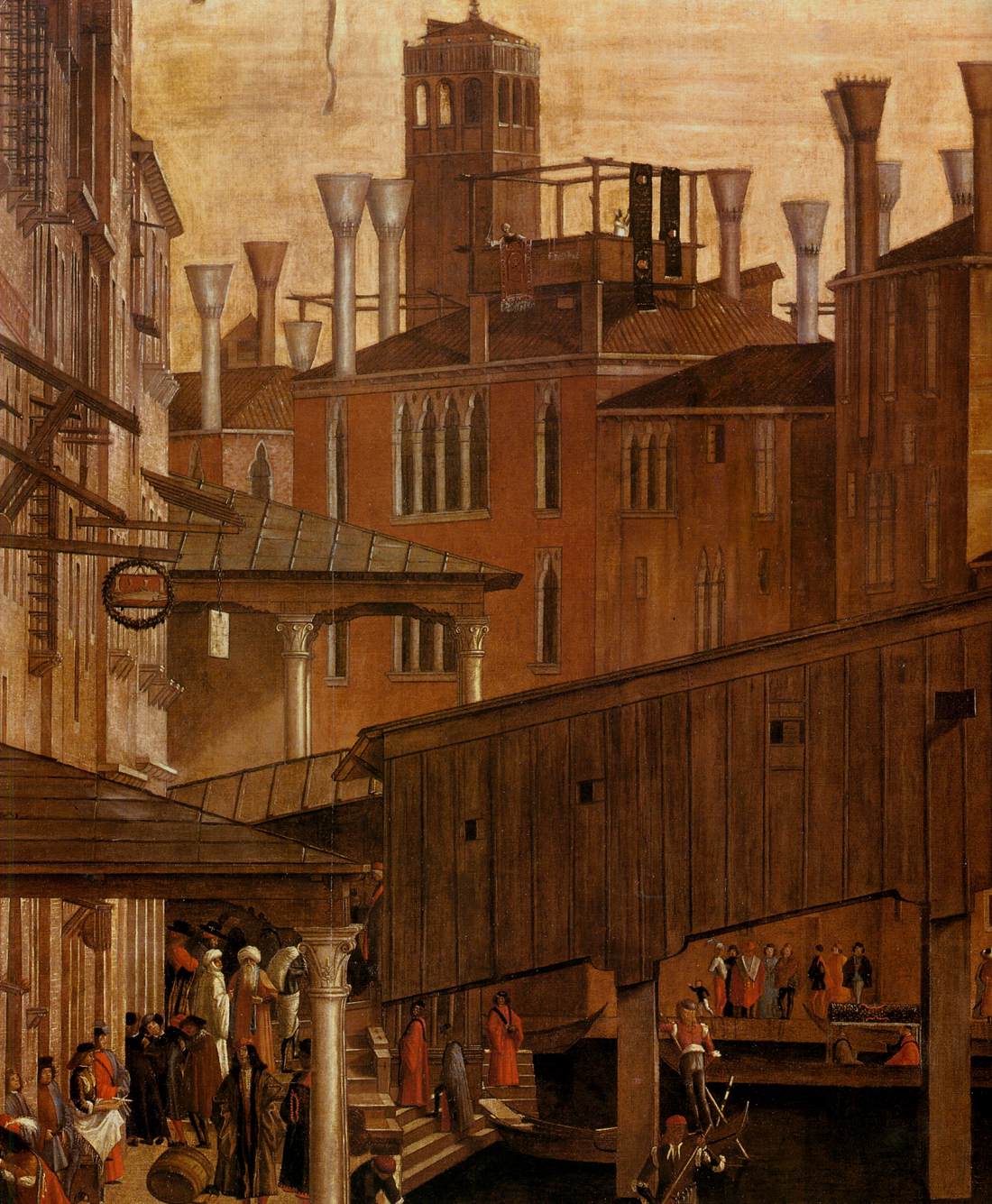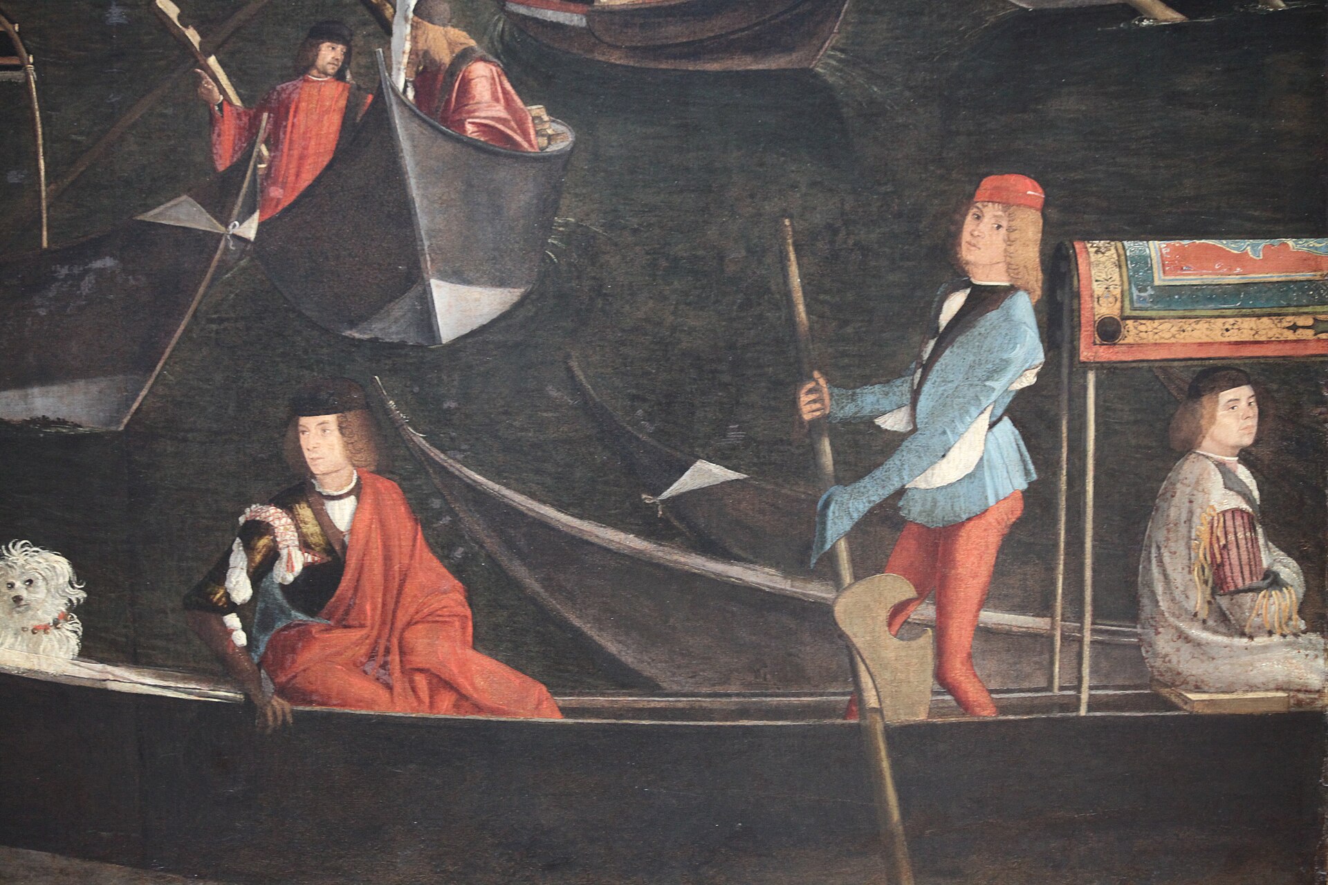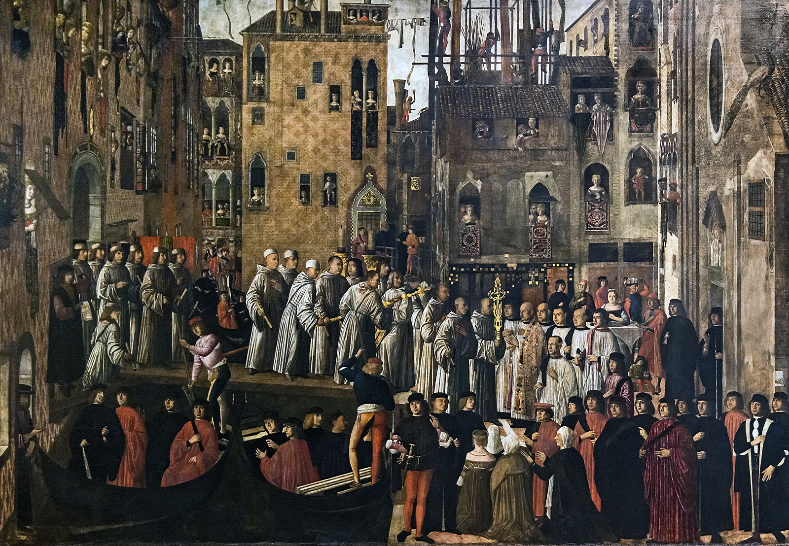 It is a wonderful picture, full of detail (like those by Gentile) which really give us an idea of how Venice looked in the 1490s—from the pub sign of a famous inn called the Sturgeon; to the skyline with its characteristic chimneys and the campanili of St John Chrysostom and the Santissimi Apostoli; to the rickety old Rialto bridge, with members of the Scuola crossing over; to the splendid costumes and portraits in the area to the lower left. Yet perhaps it is memorable above all for the tiny gondolas, criss-crossing on the dark waters of the Grand Canal.