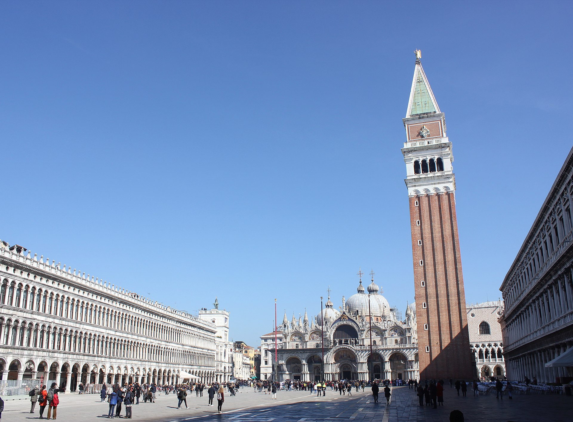 The bottom of the campanile or bell-tower is also shown; and if you know Venice well, you might ask, ‘Where is the clock-tower?’. To this, there is a simple answer: it had fallen down, and was not rebuilt until after this picture was painted.