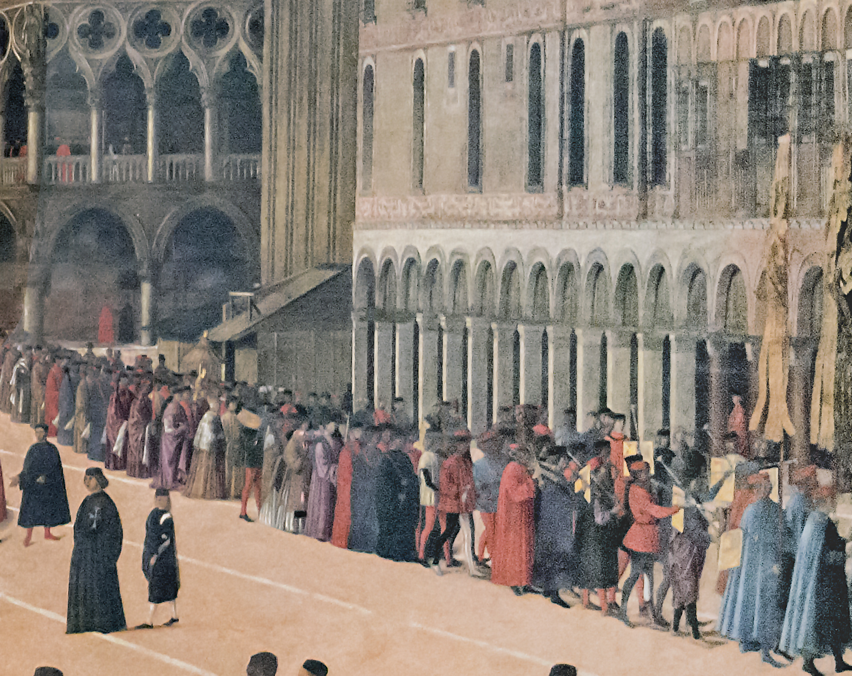 What we see in this scene is a procession on a far greater scale than that of a mere funeral like that in the Mansueti. We are looking at the real relic and reliquary, carried under a superb baldacchino. All the members of the School are there on parade, since the leaders have already gone across the Square.