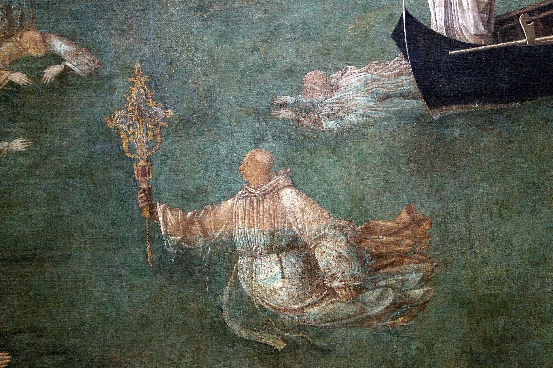 The cross, however, ‘dodged’ them all, and would allow itself to be saved only by the Guardian General of the School, who in those years was a certain Andrea Vendramin, obviously the man pictured fully dressed, but not weighed down: