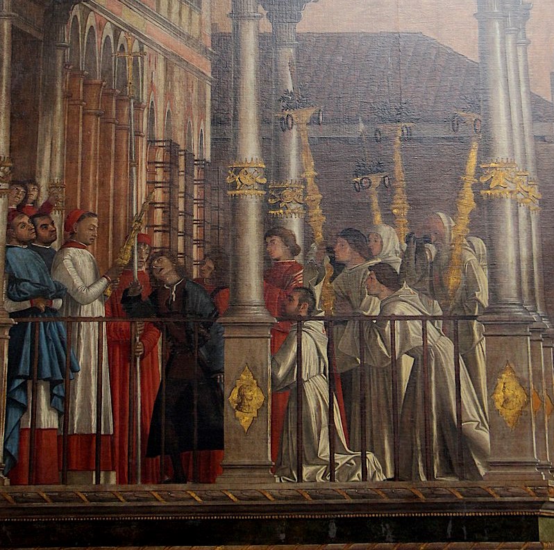 The canvas by Bastiani does not represent a miracle, but the condition sine qua non, that is, the ceremony, back in the year 1369, when the precious relic was entrusted to the Church of St John. I will say no more than that the picuture is about twelve feet high by nearly sixteen feet wide, and that it lies to the centre-right of one of the longer walls, the one which would originally have been on your right as you faced the altar, but now stands on your left as you go into the room in Accademia.