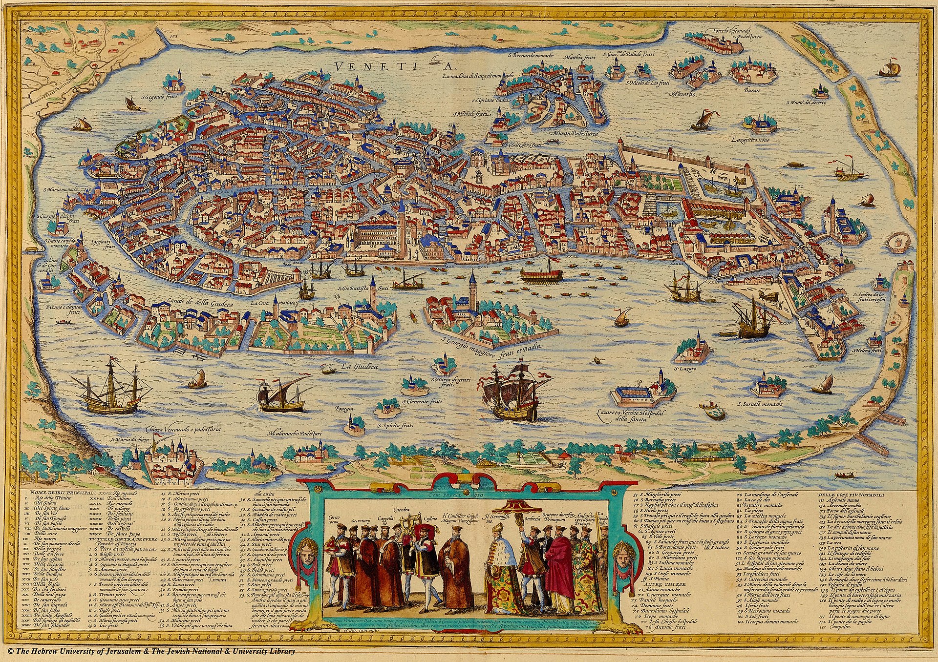 In the early fifteenth century, the Lion of St Mark ‘stepped ashore’ (as they said euphemistically), and Venice extended her rule over the vast area of the hinterland which is coloured red on the map. And far from having a hereditary ruler, Venice was a republic, in which the political power—and membership of the various Councils—was spread among the two hundred families who constituted the noble class. Even more strikingly than any other medieval or early modern city, Venice consisted of a complex series of interlocking and overlapping communities and corporations.