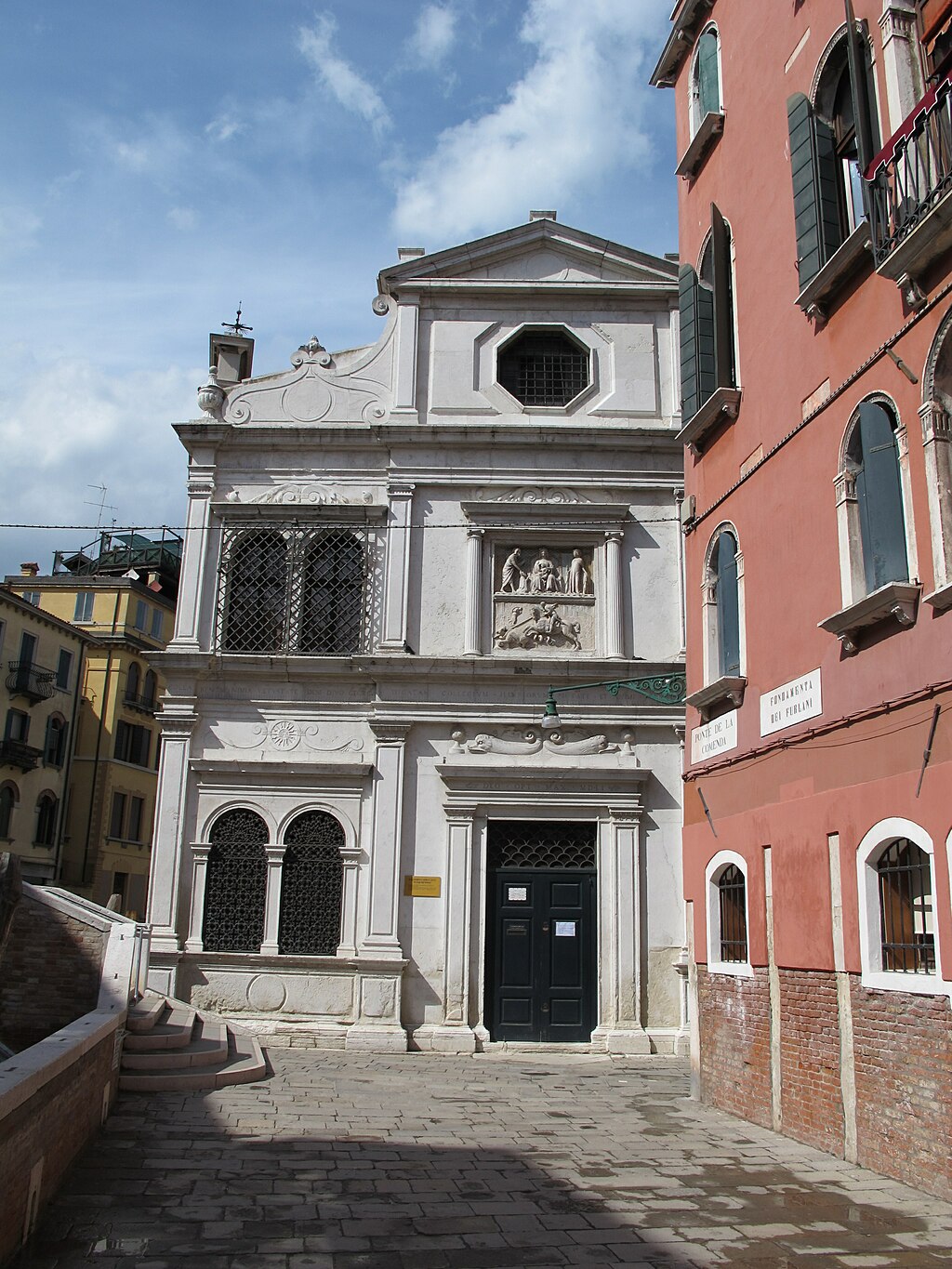 After the confraternity was suppressed by Napoleon in 1806, the canvases were removed to the Accademia, and people forgot which of the flanking buildings had been the headquarters of the School.