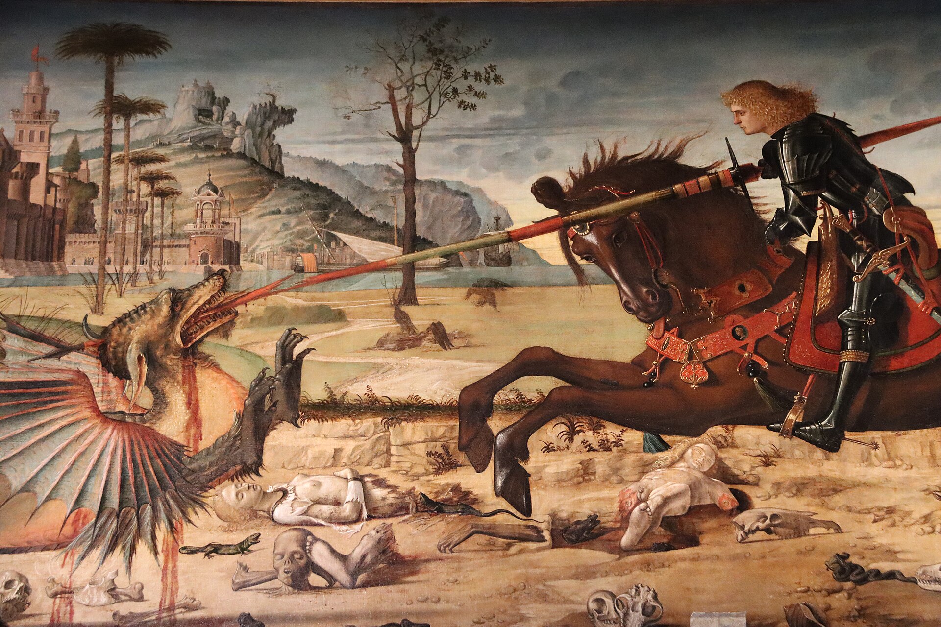 Carpaccio solves the problem of the awkard dimensions (the painting is very long and thin) here by putting the very heraldic dragon in profile, except for his tail; by giving George a lance, instead of the sword mentioned in his text; by putting the horse too in profile, except for its head; and by stretching out the front legs and tail of the horse as far as they will go.