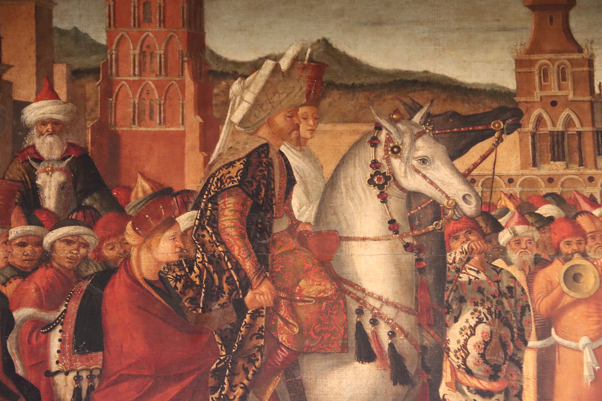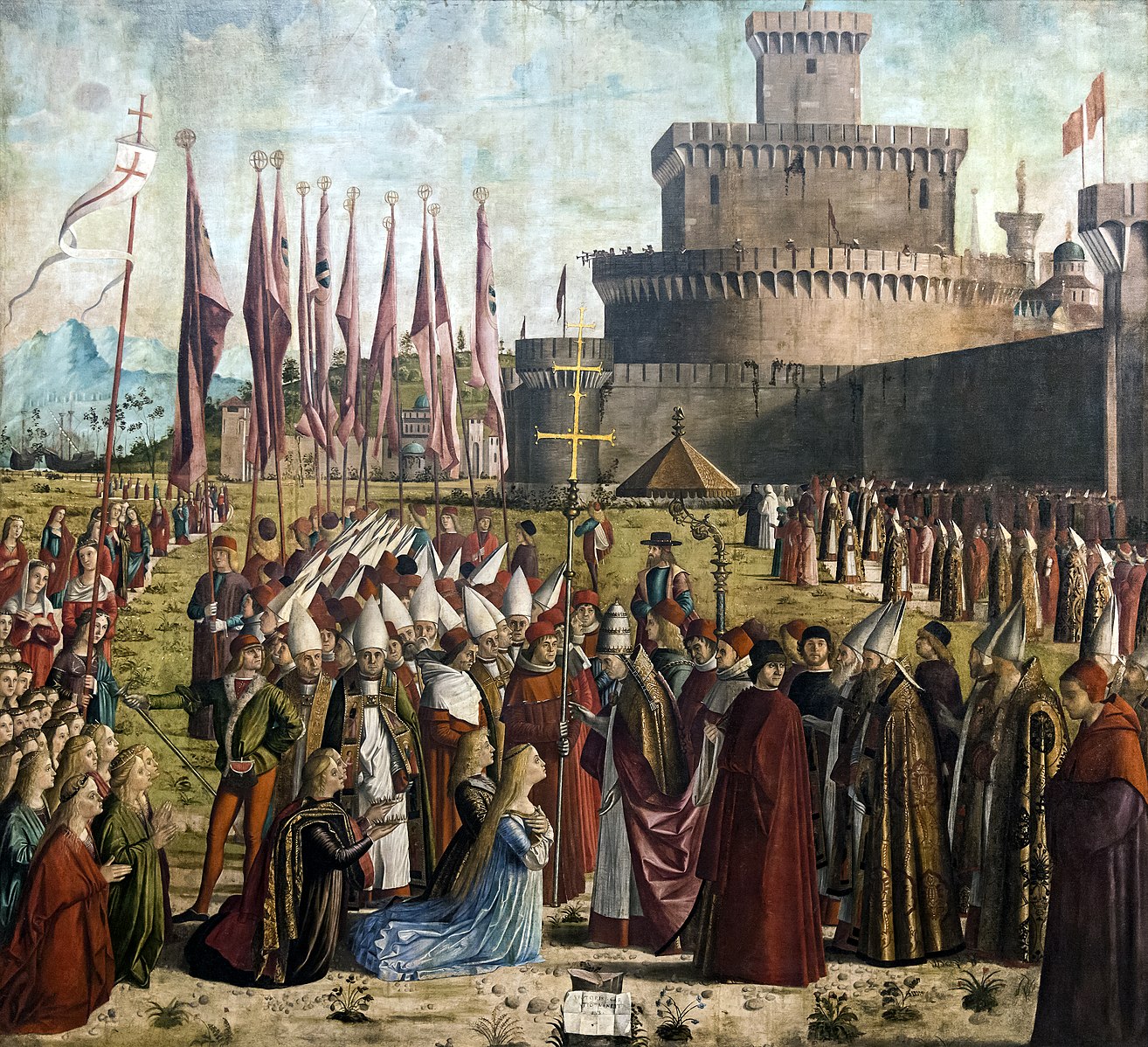 He chooses to represent the meeting of two processions. From the right, with the light behind them, the ‘clergy’ emerge from the gate of Rome—including an enormous number of bishops. Then they vanish from view, before reappearing to line up behind the pope, who is shown wearing his tiara underneath the portable baldacchino. Typically, Carpaccio relishes the opportunity to represent the superb ecclesiastical capes of the senior bishops in his retinue.