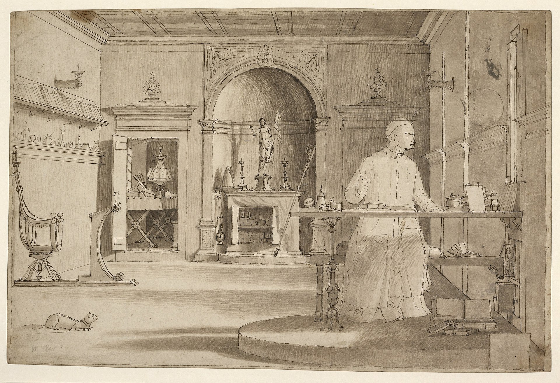 Even having looked hard at the drawing, though, one still wants to enjoy the colours of the original, and the amazing wealth of detail in this recreation of the study of a humanist cardinal in the late fifteenth century—some say that it is intended to be a posthumous portrait of Cardinal Bessarion, who had died in 1472, thirty years earlier. Focus on the altar, with its statue of the risen Redeemer, between the candlesticks and the bishop’s mitre and staff, and on the cupboard below which contains the vessels needed to celebrate mass, complete with a curtain to conceal the vessels when necessary. And enjoy the splendid red leather chair with brass studs, attached to the prie-dieu in front of the well-stocked bookshelf, and the sill with all its bric-a-brac; and in the corner (see detail in Figure 00 FIXME), notice the closet with a folding table, and a four-sided lectern with books and instruments.