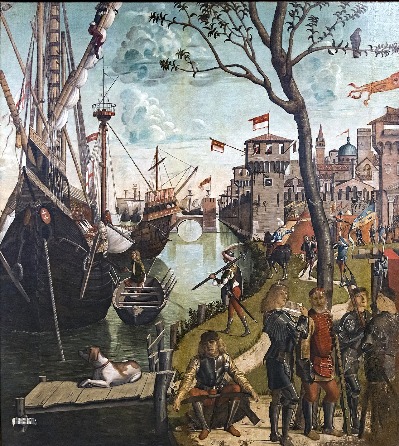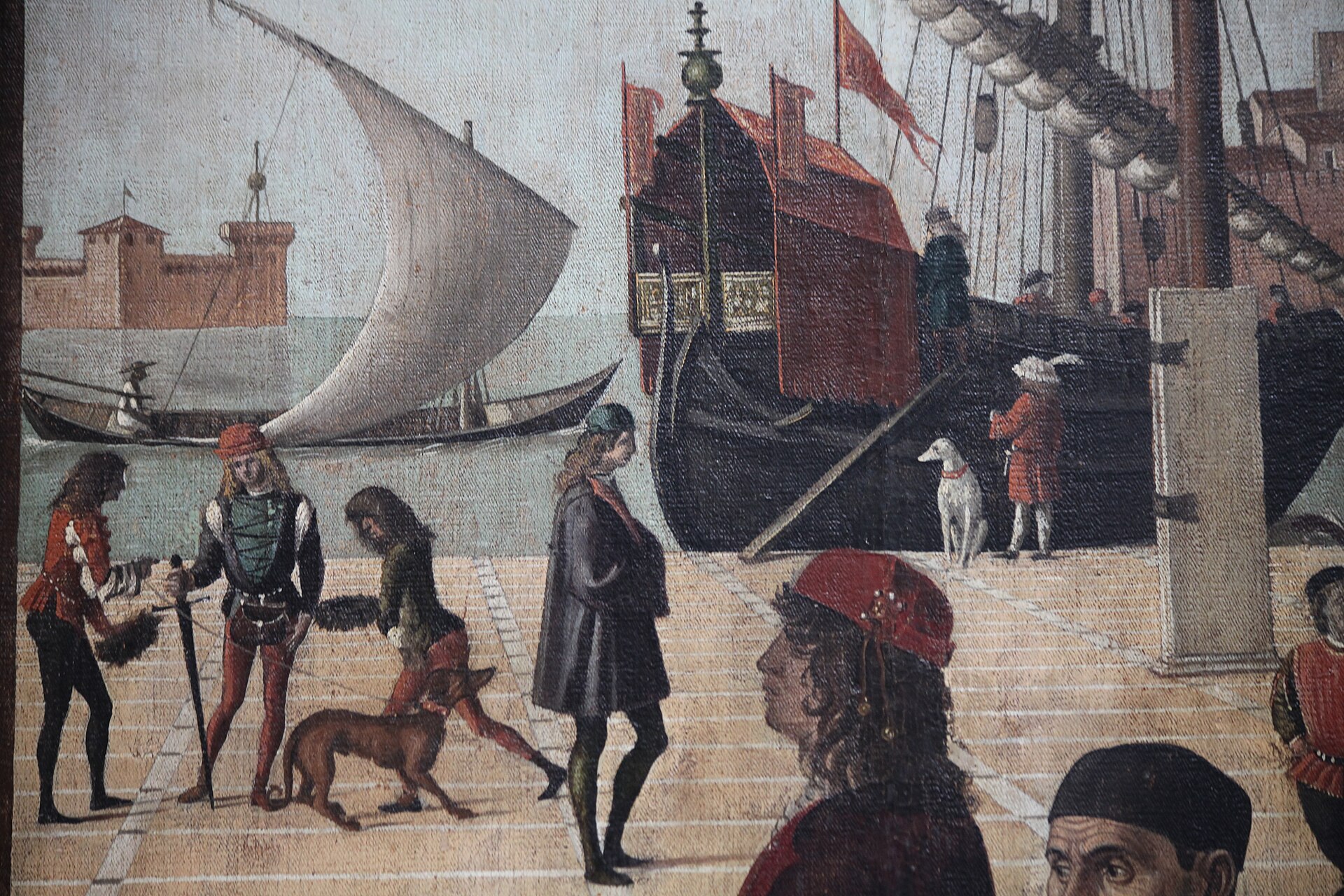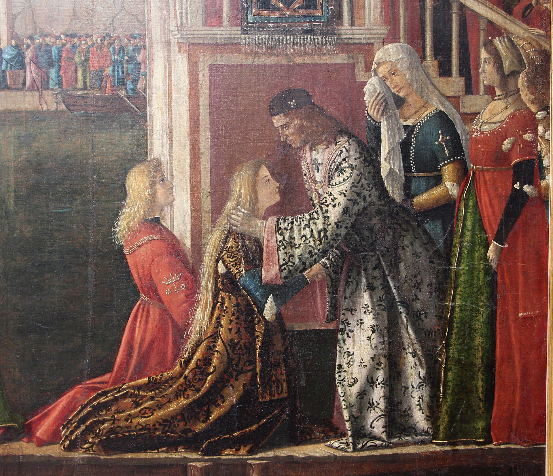 On the left, you can just make out some ships, from which there advance—on a narrow strip of carpet—the 11,000 virgins, who also disappear to the left (to suggest the numbers), and re-emerge, kneeling, in the left foreground behind Princess Ursula and Prince Ethereus. They are very much the royal couple, as the crowns held out behind them remind us.