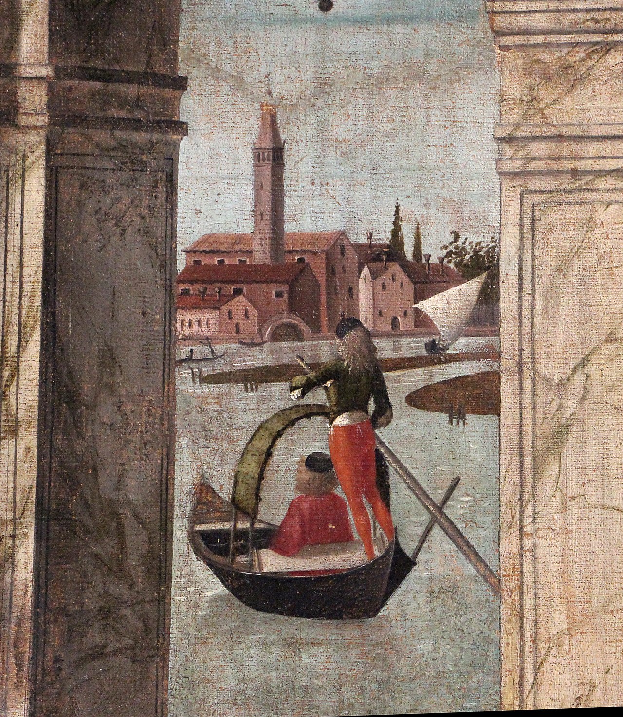 The miracle represented was the most recent of all, since it took place in 1494. The loggia represents the town palace of a certain Francesco Querini, a high ecclesiastic, patriarch of Grado (a town on the coast near Trieste).