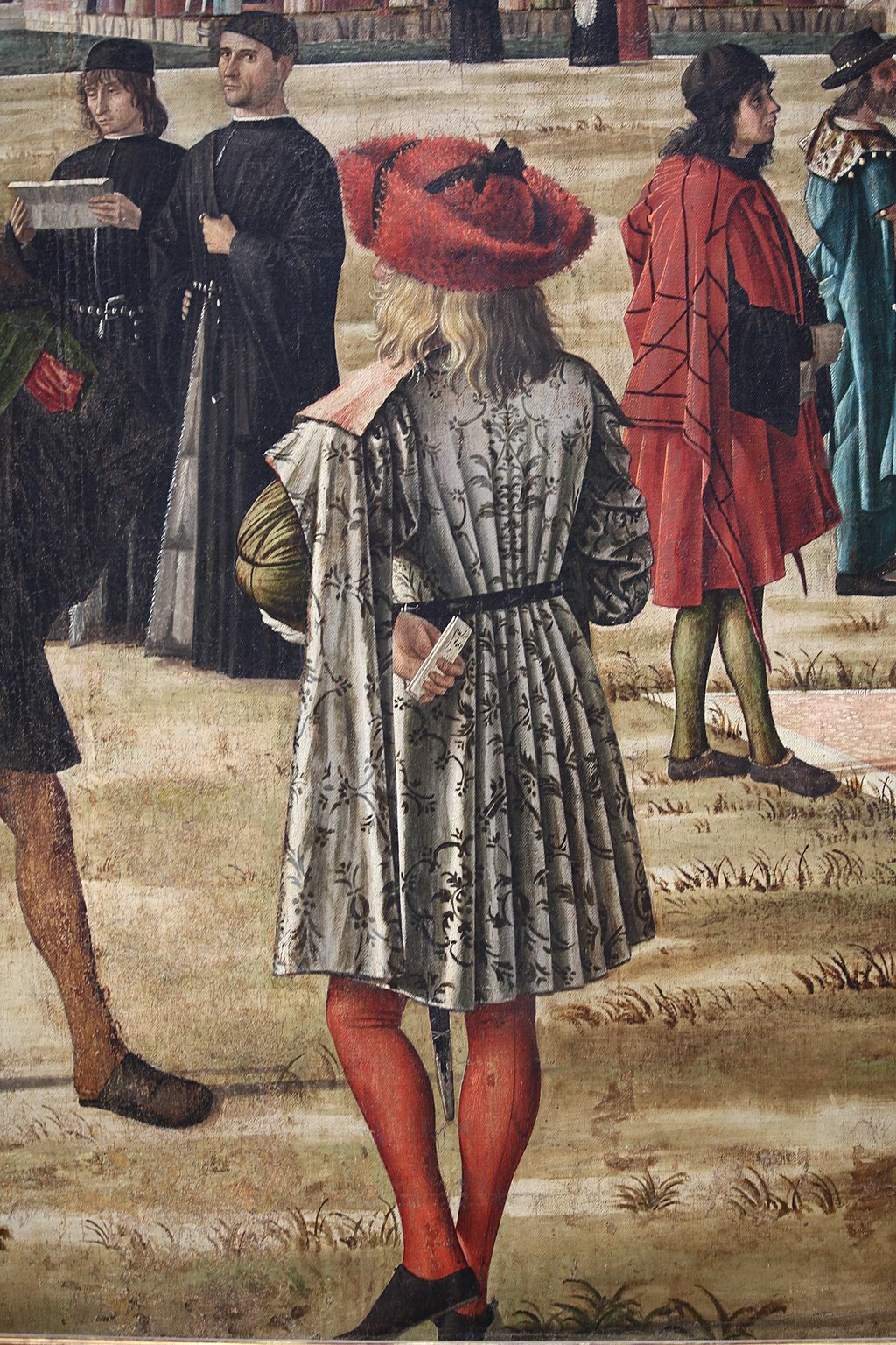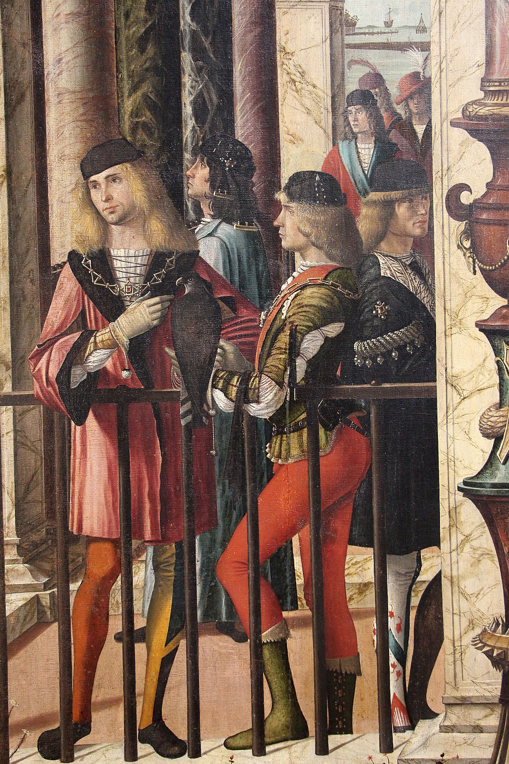 One may, then, interpret the gorgeous robes as a sign of ‘solemnity’, and the three levels of kneeling as a mixture of ‘flattery’ and ‘threat’. We should pause, though, to look at the area on the left in order to admire the magnificent polychrome marble column, (with its very unclassical base, and its very ‘Flemish’ cast shadow), and, in particular, the portrait studies of the young noblemen who are sitting negligently (con sprezzatura) with a falcon on the railing. Every detail of their attire is lovingly observed: the hose (wrinkles and all), the doublet or coat, the slashed sleeves and draw strings, the shoulder-length hair, and the flat hats.