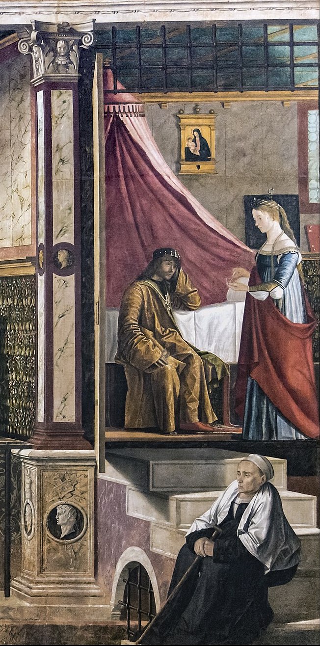 Similarly, it is well-known that the ladies on the left represent Caterina Cornaro and her retinue, she being a Venetian noble-woman who married the King of Cyprus in 1472, and ruled Cyprus as its Queen on his death in 1474, until she ceded the island to Venice in 1489—that is, only 11 years before this was painted, for it is dated 1500.