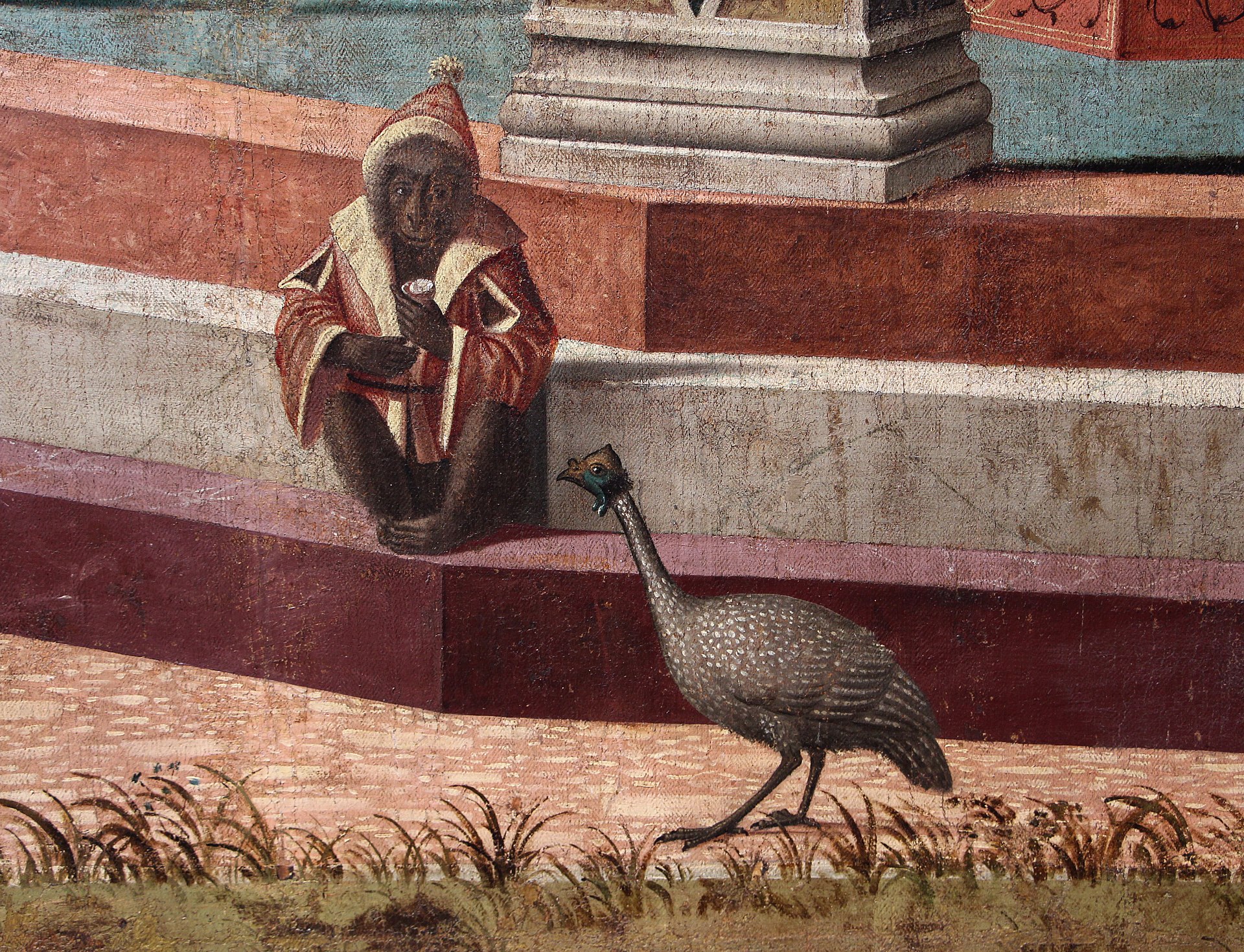 The whole surface is crowded with highly enjoyable details, but none is perhaps more charming than the monkey on the steps of the loggia (Figure 00 FIXME) who is dressed in a jester’s costume and senatorial robes, and is curling his toes just as babies do, while clearly determined not to give his ice-cream or bun to the advancing guinea fowl: