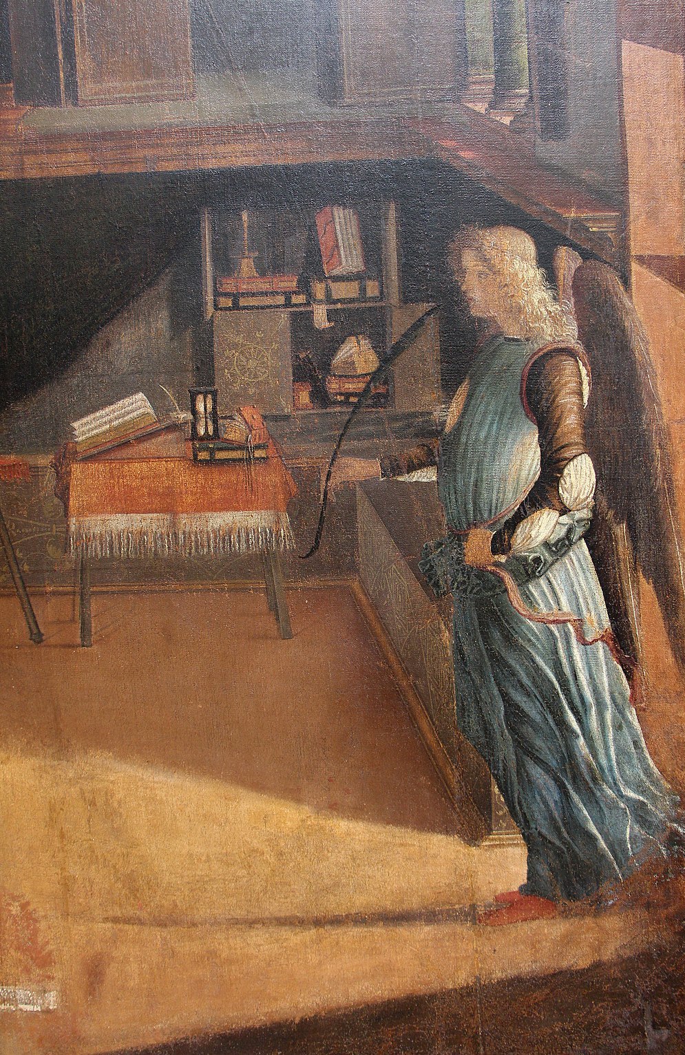 The story could hardly be simpler: ‘the Lord appeared to Ursula and foretold to her that they would every one return to Cologne, and would there win the crown of martyrdom’. But the supernatural vision provides the excuse for one of the most memorable and detailed domestic interiors to be found anywhere in Italian fifteenth-century painting, and also for one of the most ‘poetic’ studies of the fall of light. Remember that the natural light used to come from over the altar in the School of St Ursula (that is, from the east end), and notice that the pictorial light is represented as falling right to left, as you can clearly see in the detail (Figure 00 FIXME) of the angel holding the palm of martyrdom in his hand.