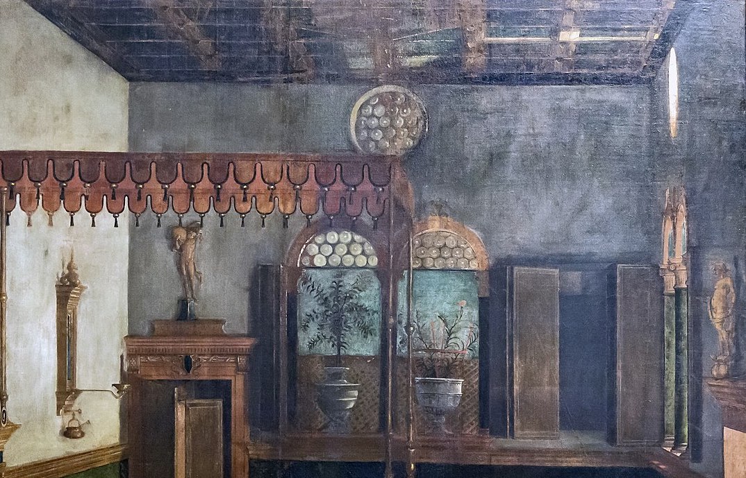 It is not a very flattering photo, but it does at least give some idea of the scale and proportions. The main room inside was only about 60 feet long by 25 feet wide and so the elegant reconstruction-drawing offered by Ludwig and Molmenti is far too grand: