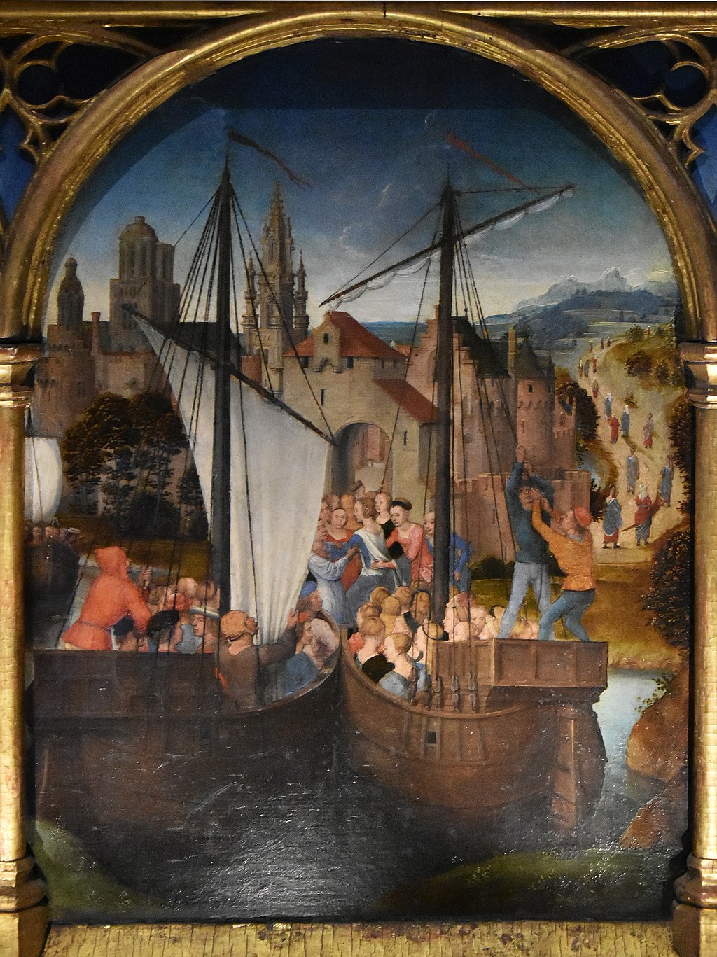 The main point of the switch is to allow you to register the huge difference in conventions between Italian Renaissance Art and Northern Gothic Art; but Memling’s picture will also enable us to follow the eleven thousand virgins (here reduced to eleven) on their journey, because, in the words of the Legend: ‘At length in the space of one day a favourable wind bore them to a port in Gaul whence they went to Cologne’.