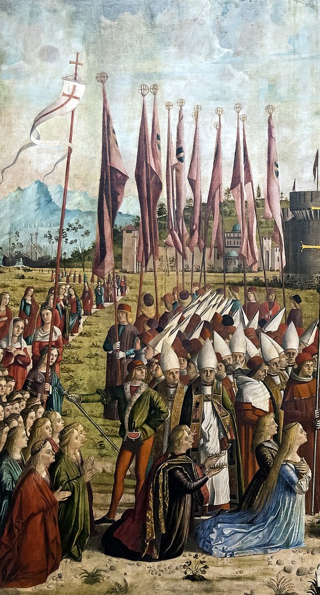 There was in Brittany a most Christian king named Maurus, who had a daughter called Ursula. She shone with such wisdom, beauty, and holiness of life, that her fame became known everywhere. The king of England heard the renown of this virgin, and declared that his happiness would be complete if she became the wife of his only son. He therefore sent a solemn embassy to the damsel’s father. The ambassadors lavished promises and flattery upon the king, but added dire threats if they should be sent back empty-handed.