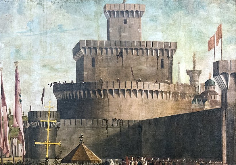 In the background, Carpaccio borrows from some woodcut or medal to give a fairly accurate representation of Castel Sant’Angelo, adding his own loving representation of the light that warms the right side of the gigantic barrel, and slants across the wall. But this early picture is chiefly remarkable for the contrast between the huge area of ochre (in walls, ground and clouds) and the bright colours and abstract patterns of the red banners and the white mitres of the bishops.